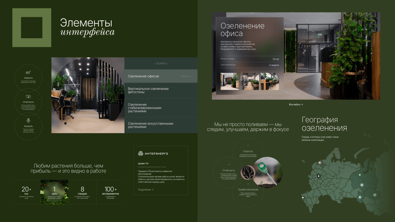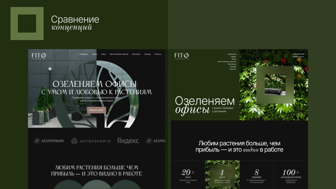 К нам обратились «Фито-Технологии» — профессионалы, превращающие офисные пространства в зеленые оазисы. Их география охватывает Москву, Санкт-Петербург, Краснодар, Новосибирск и другие города. Несмотря на опыт, солидную репутацию и поток клиентов из офлайна, у компании не было сайта, который бы по-настоящему отражал ее уровень.