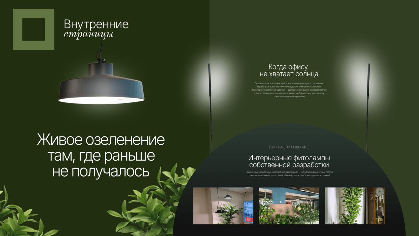 Как передать идею заботы и технологичного сервиса? Мы решили эту задачу через анимацию фитоламп. При прокрутке они загораются, показывая, как растения в проектах получают досветку.