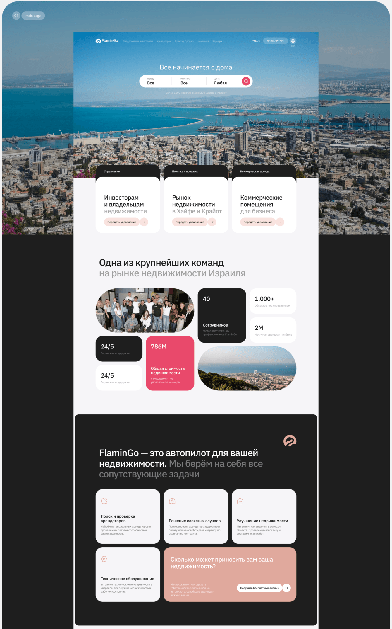 - Учесть пожелания клиента: чистый стиль в духе Airbnb, Bento-верстка для современного вида, атмосферное фото Хайфы (где находится офис) на первом экране.