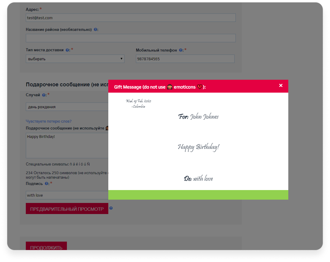 Когда покупатель делает заказ, он может заполнить имя получателя, текст сообщения, добавить смайлы и постскриптум. Администраторы Floristería напечатают это на карточке-открытке и вложат в букет. Удобно то, что отправитель сможет посмотреть превью и убедиться, что все выглядит именно так, как он хочет.