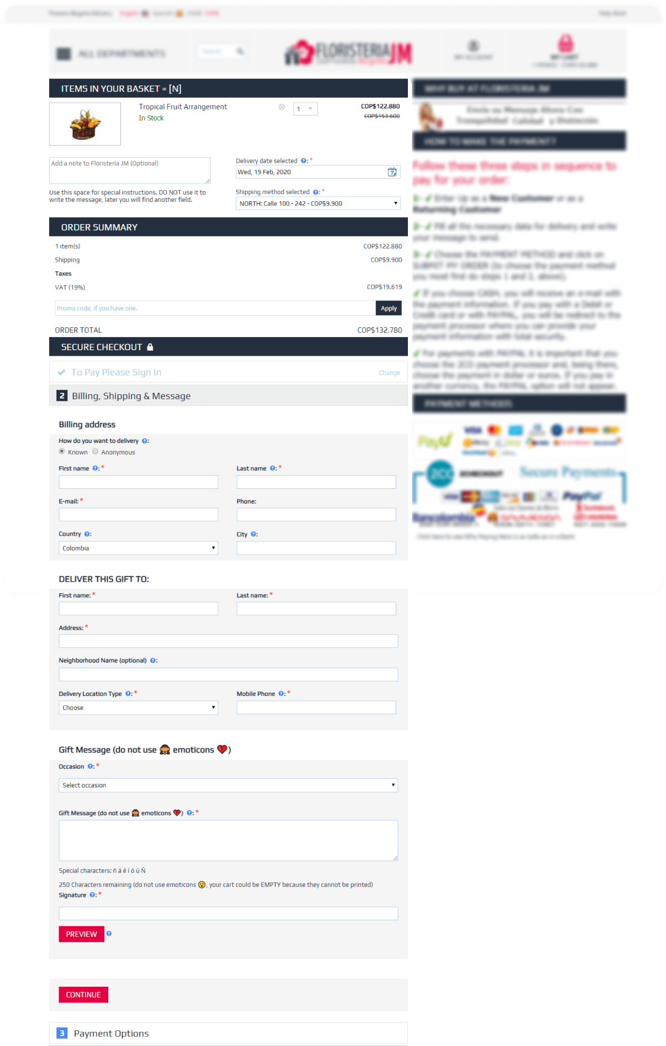 Floristería доставляет цветочные и фруктовые букеты, корзины сладостей, подарочные композиции по Боготе (Колумбия). В каждом заказе есть свежие цветы или сладости, поэтому особенность проекта — оперативная доставка в любую точку города. У клиента два сайта: собственный интернет-магазин Floristería и маркетплейс BogotaCompra, где Floristería присутствует как один из продавцов. Все доработки мы производили аналогично для обоих сайтов.