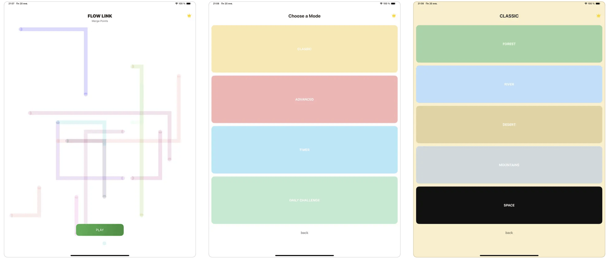 Создать мобильную игру-головоломку Flow Link, которая будет сочетать в себе простоту управления и увлекательный, продуманный игровой процесс. Ключевые задачи: Разработка понятного и лёгкого в освоении интерфейса. Реализация механики соединения элементов на игровом поле. Проработка уровней различной сложности для вовлечения пользователей всех возрастов. Адаптация игры для устройств на iOS и Android. Обеспечение плавного игрового процесса без задержек и с минимальной нагрузкой на устройство. Основная цель — создать игру, в которую хочется возвращаться снова и снова.