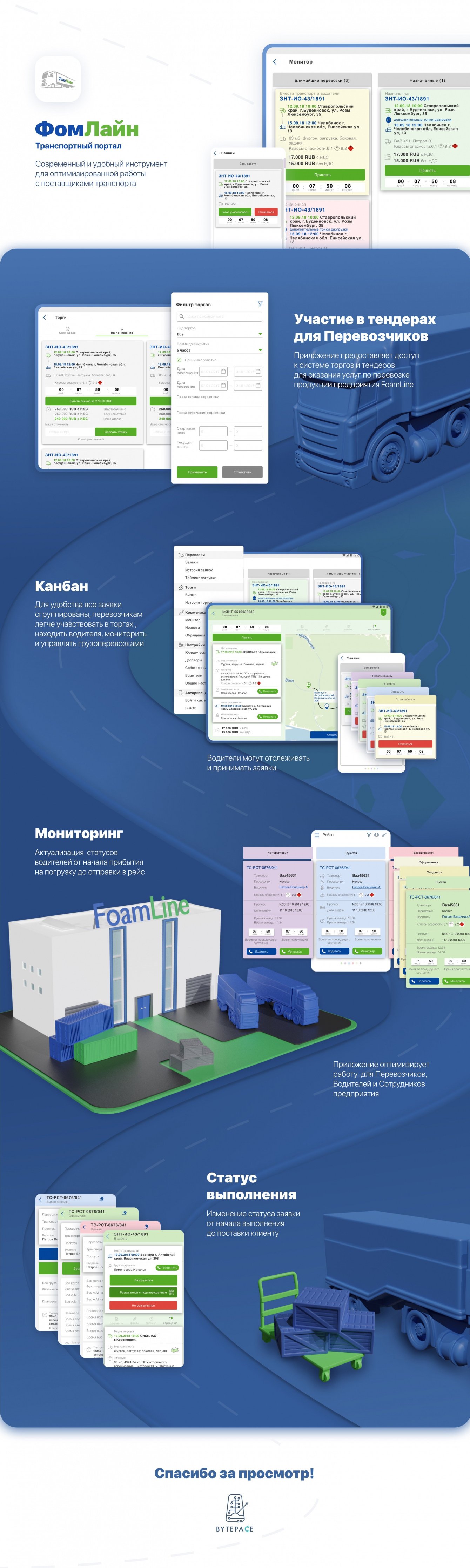 Задача: Разработать приложение для управления грузоперевозками клиентов ФомЛайн. Решение должно было объединить три роли - "Перевозчика", "Водителя" и сам "Завод" с которого осуществлялась отгрузка продукции, а так же систематизировать и упростить работу перевозчиков за счёт наличия удобной системы распределения заявок.