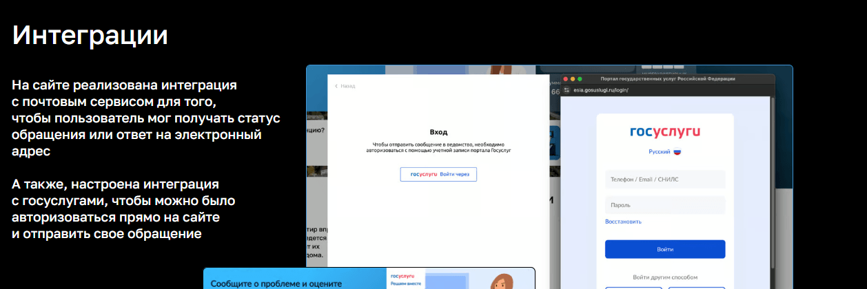 А также, настроена интеграция с госуслугами, чтобы можно было авторизоваться прямо на сайте и отправить свое обращение.