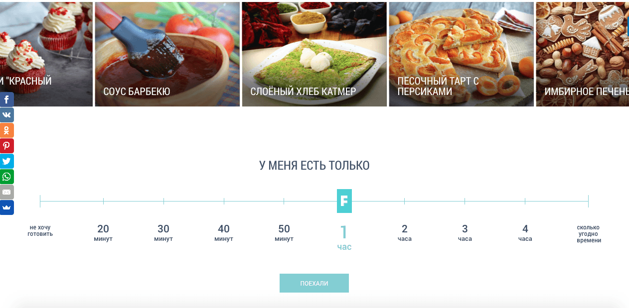 Сервис встречает пользователя двумя слайдерами с красивыми фотографиями блюд. Выбирай любое и готовь то, что понравилось! Ещё на главной странице для любителей готовить разработана шкала выбора времени приготовления блюд. Так, например, если вы ограничены во времени, сервис поможет подобрать рецепты, приготовление которых займет всего 20 минут. В случае, если времени на приготовление нет, можно оформить заказ еды из ресторанов и служб доставки непосредственно со страницы «Не хочу готовить».