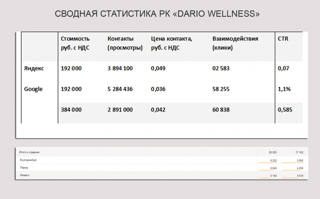 Стоимость контакта = ~0,042 руб., в 2,5 раза дешевле размещения на телевизионных каналах. Важно, что учитываются только “засчитанные показы” (баннер был в поле зрения достаточное время).