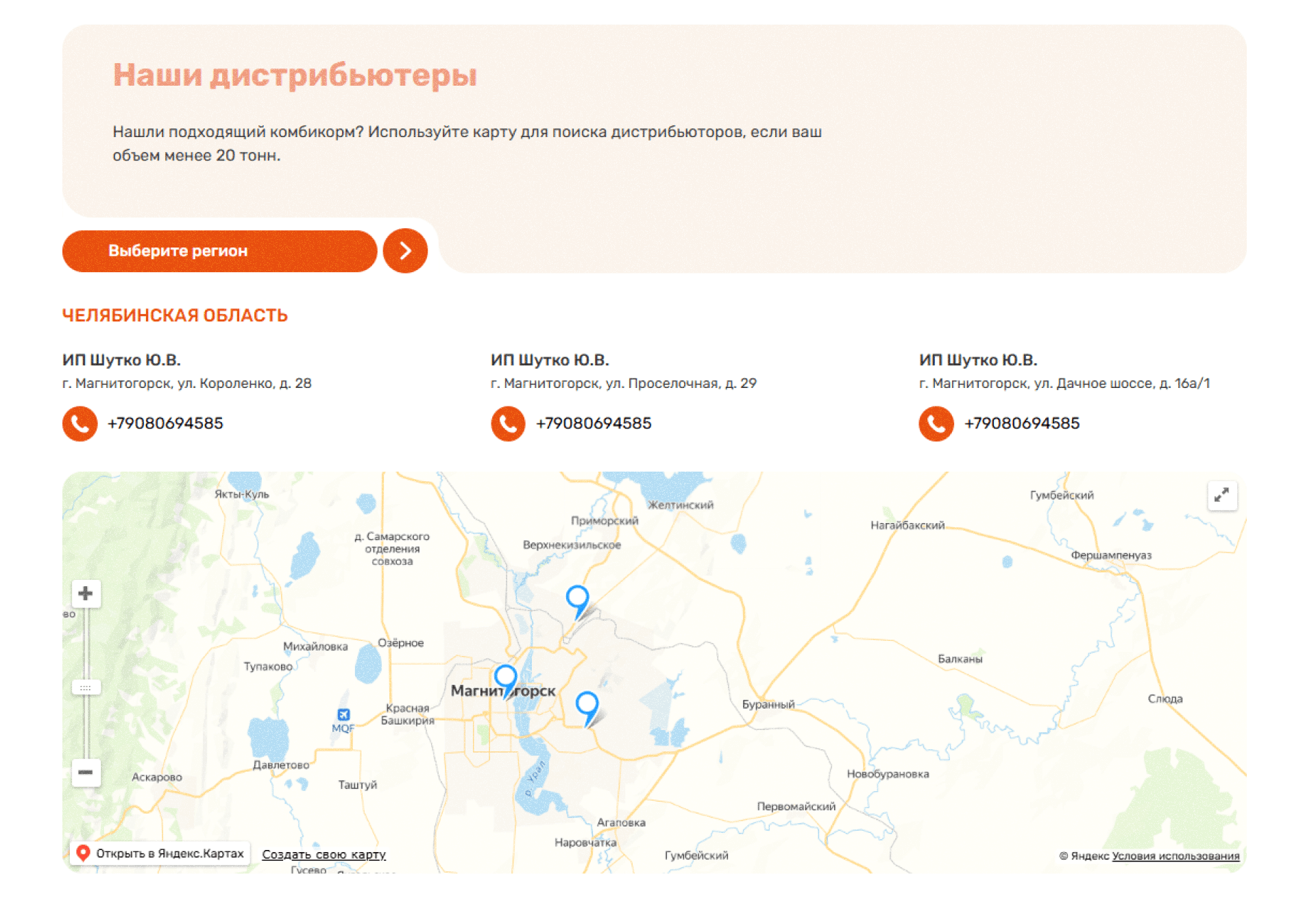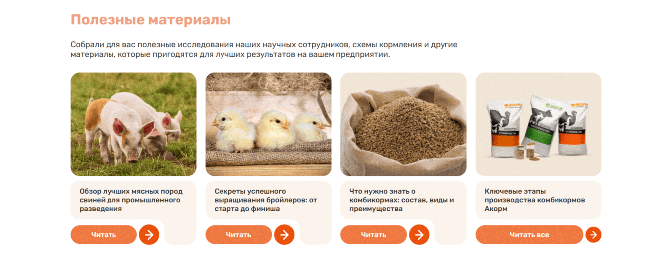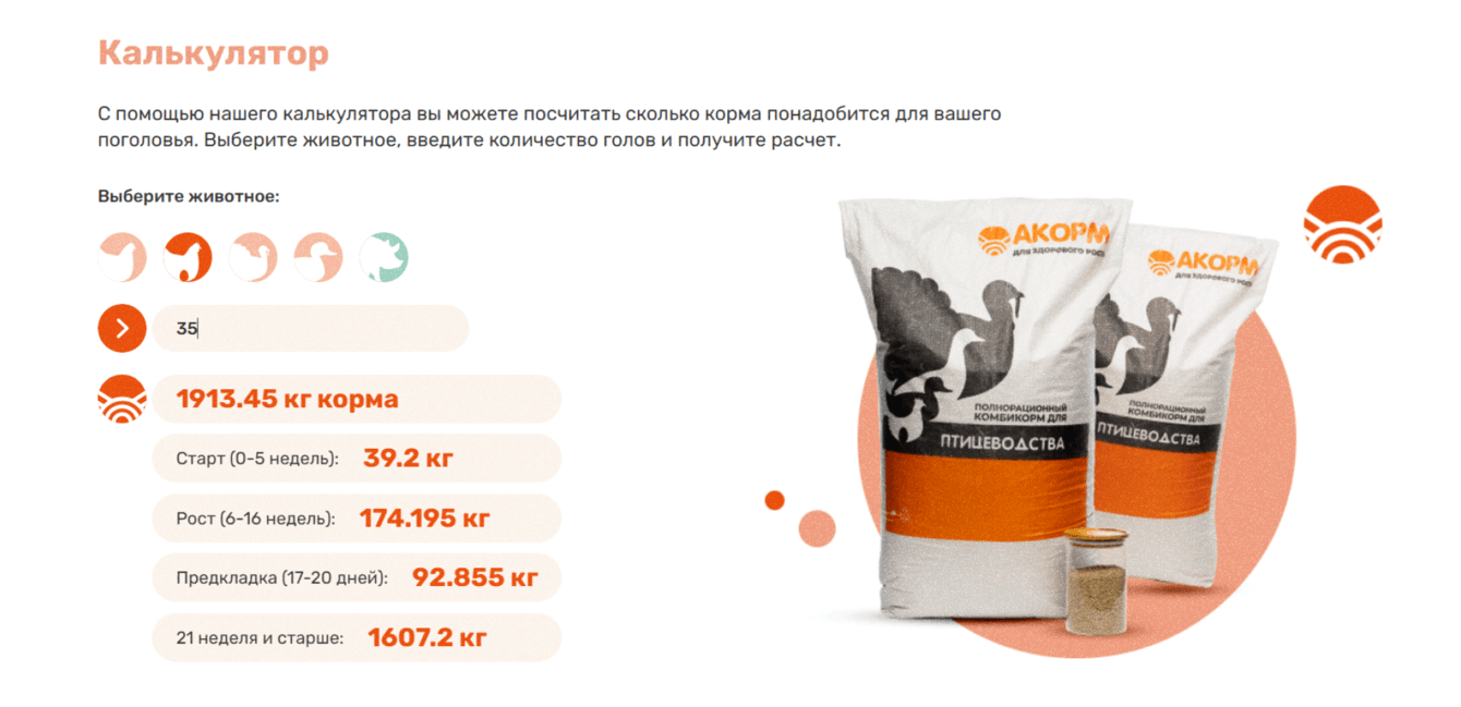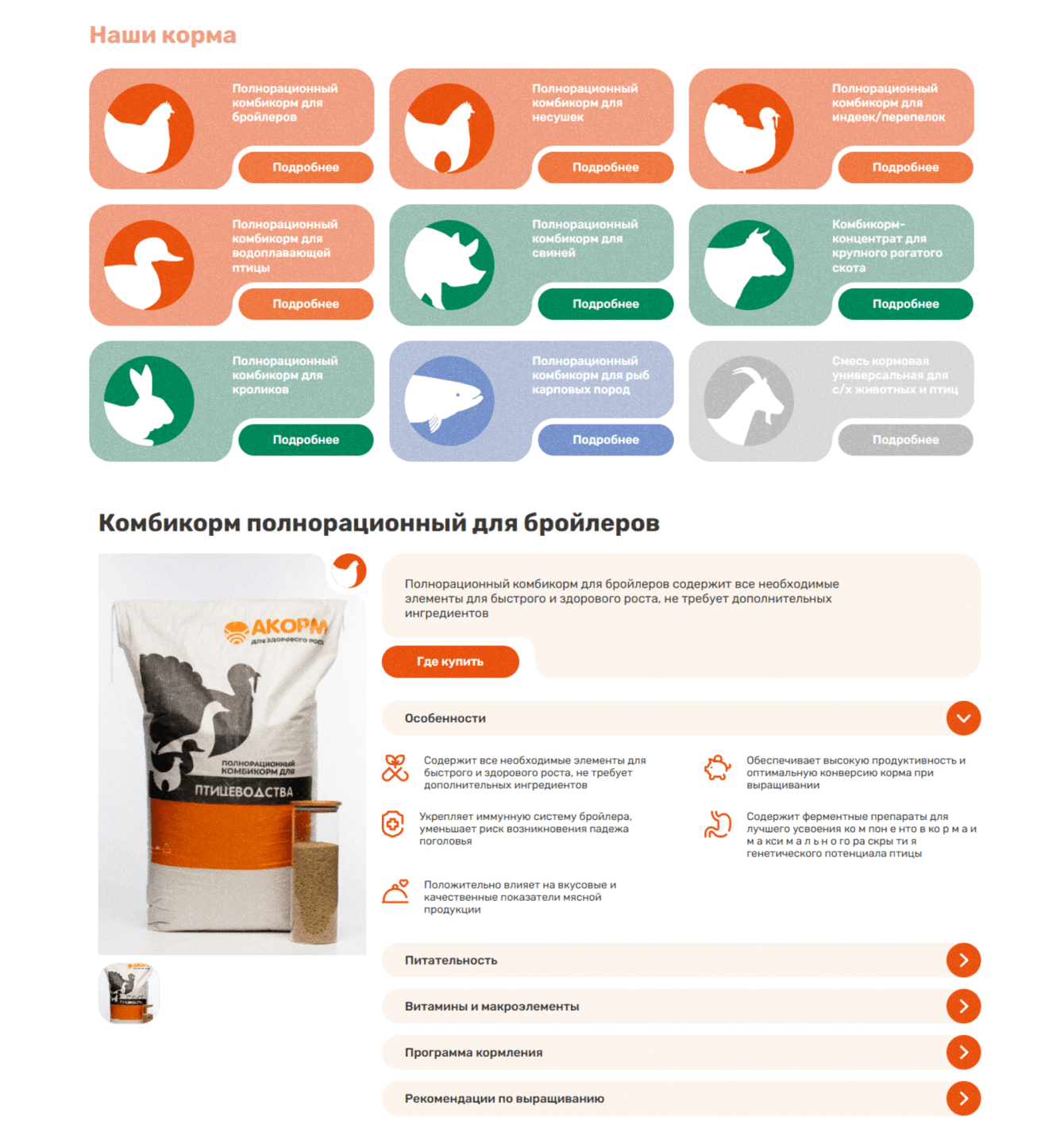 Поэтому сайт мы сделали максимально прикладным: каталог помогает сравнить ассортимент и быстро выбрать подходящий продукт, калькулятор убирает догадки при расчётах, а карта дистрибьюторов экономит время и показывает, где купить корм рядом. Всё это формирует доверие и облегчает процесс принятия решений.