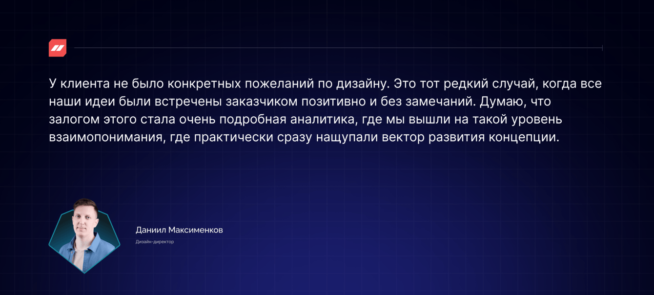 Она направлена на демонстрацию устойчивости, точности и надёжности компании. Основная идея в использовании сетки, которая формирует направляющие и ведёт пользователя, а также в использовании стилизованной линейной иллюстрации.