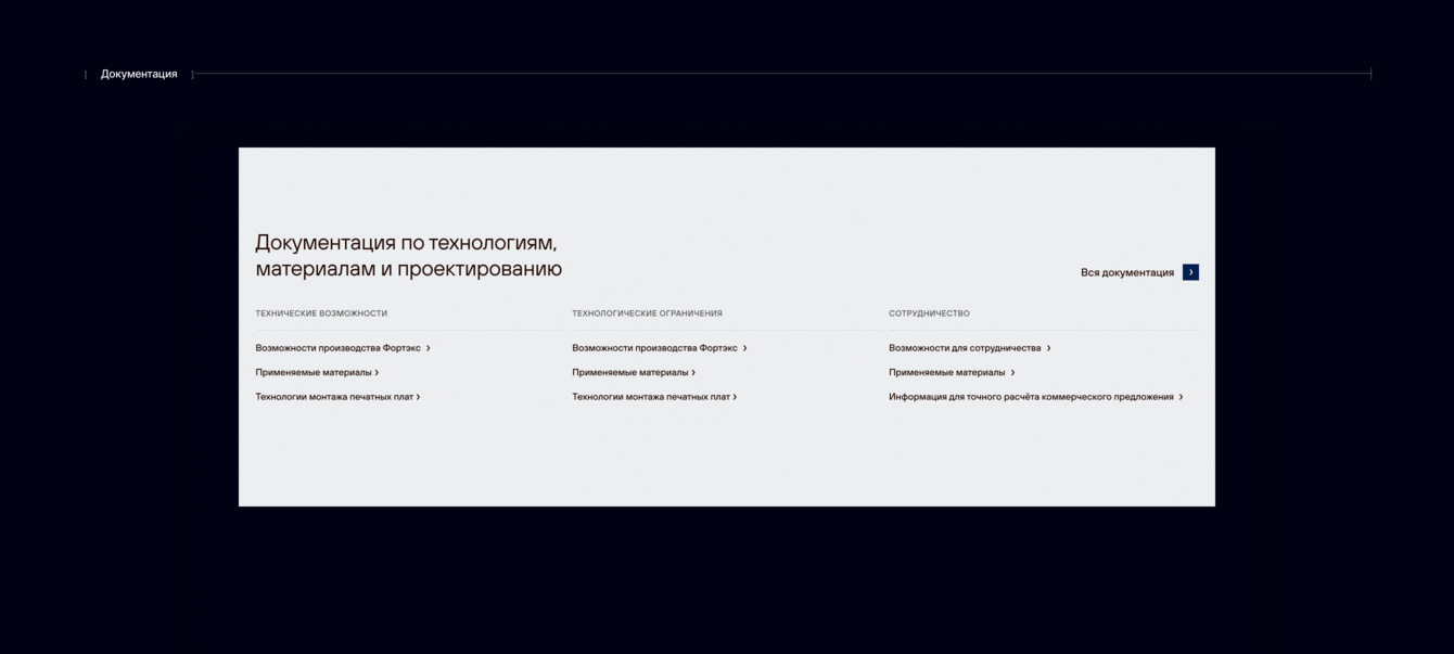 В отличии от первой концепции, в данном блоке показываем основные статьи по трём различным направлениям и предлагаем пользователю перейти в раздел со всей документацией.