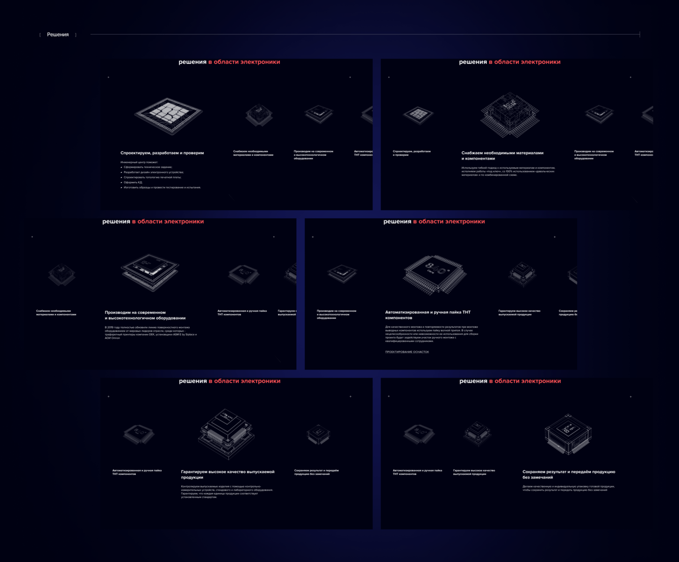 Процесс изучения сайта на главной странице теперь стал похож на экскурсию по производству, когда по скроллу вниз пользователь видит сначала чертеж микросхем, а потом как она «обрастает» транзисторами и сложными техническими устройствами, тестируется на наличие ошибок, и готовится к отправке до конечного потребителя.