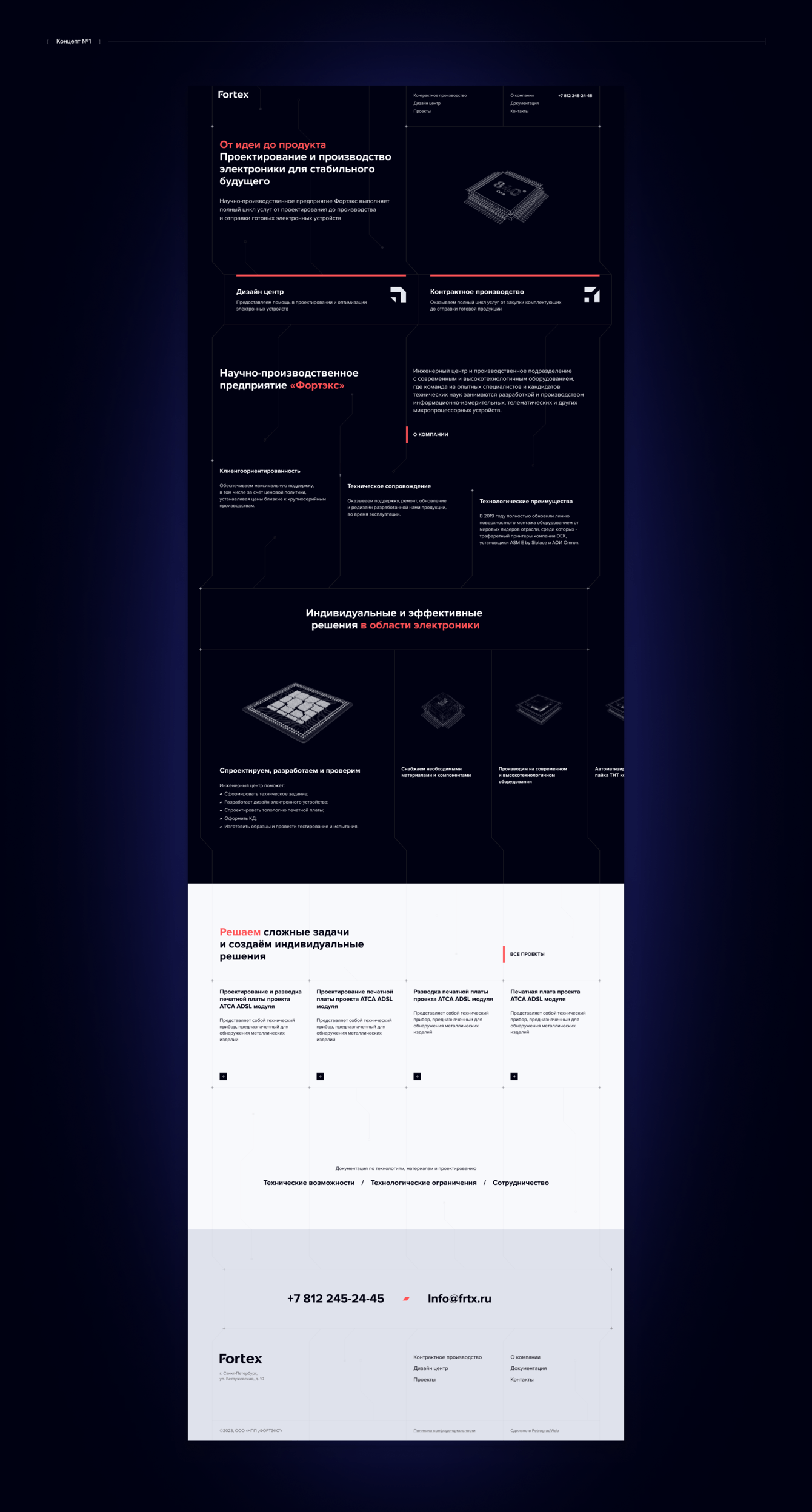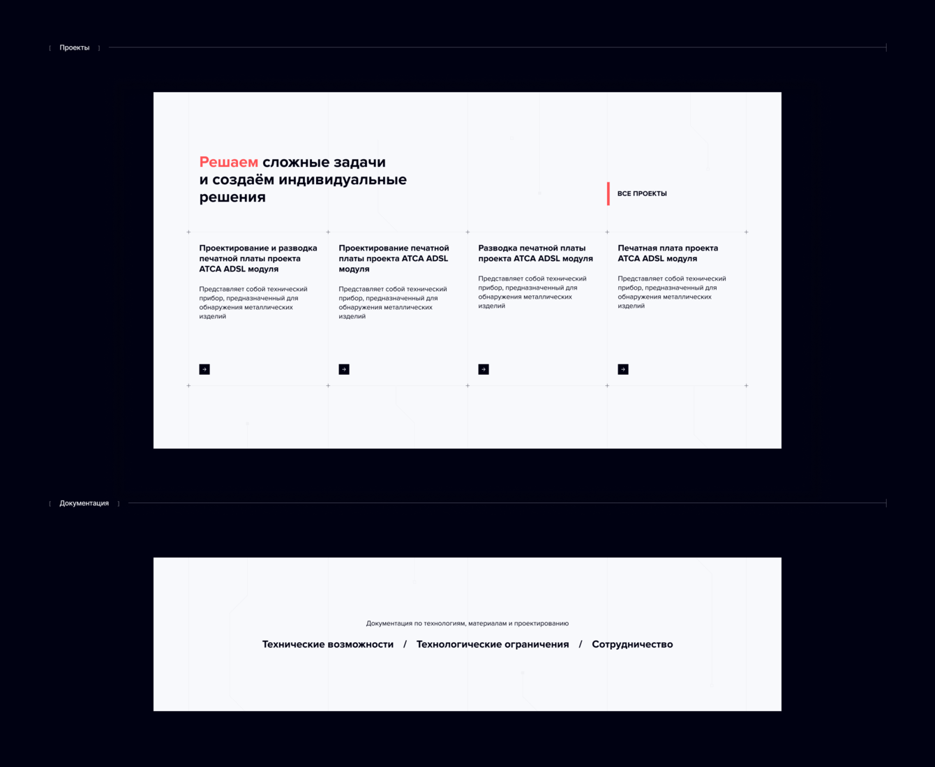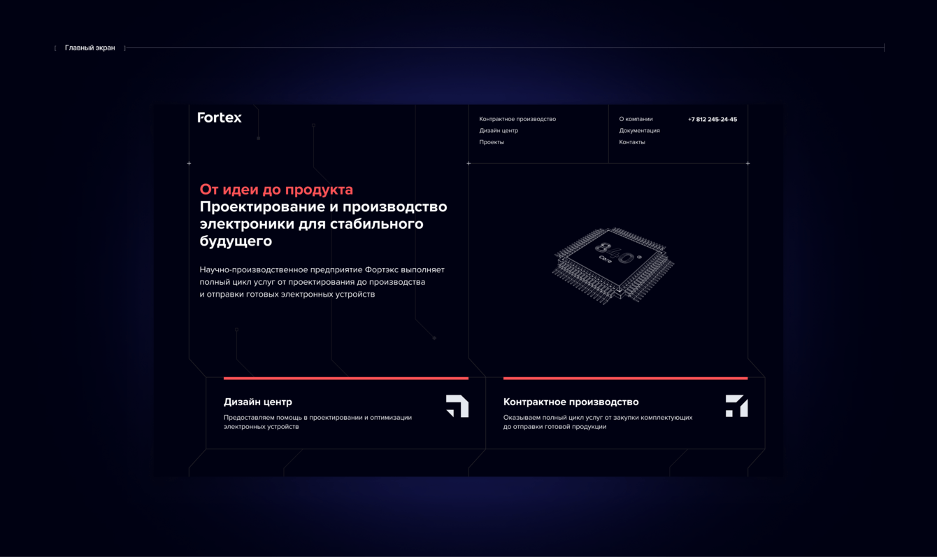 На главном экране изображена стилизованная анимированная плата. Делаем важный акцент на двух направлениях компании с помощью сетки и иконок. Перейти в раздел, можно нажав на всю карточку направления.