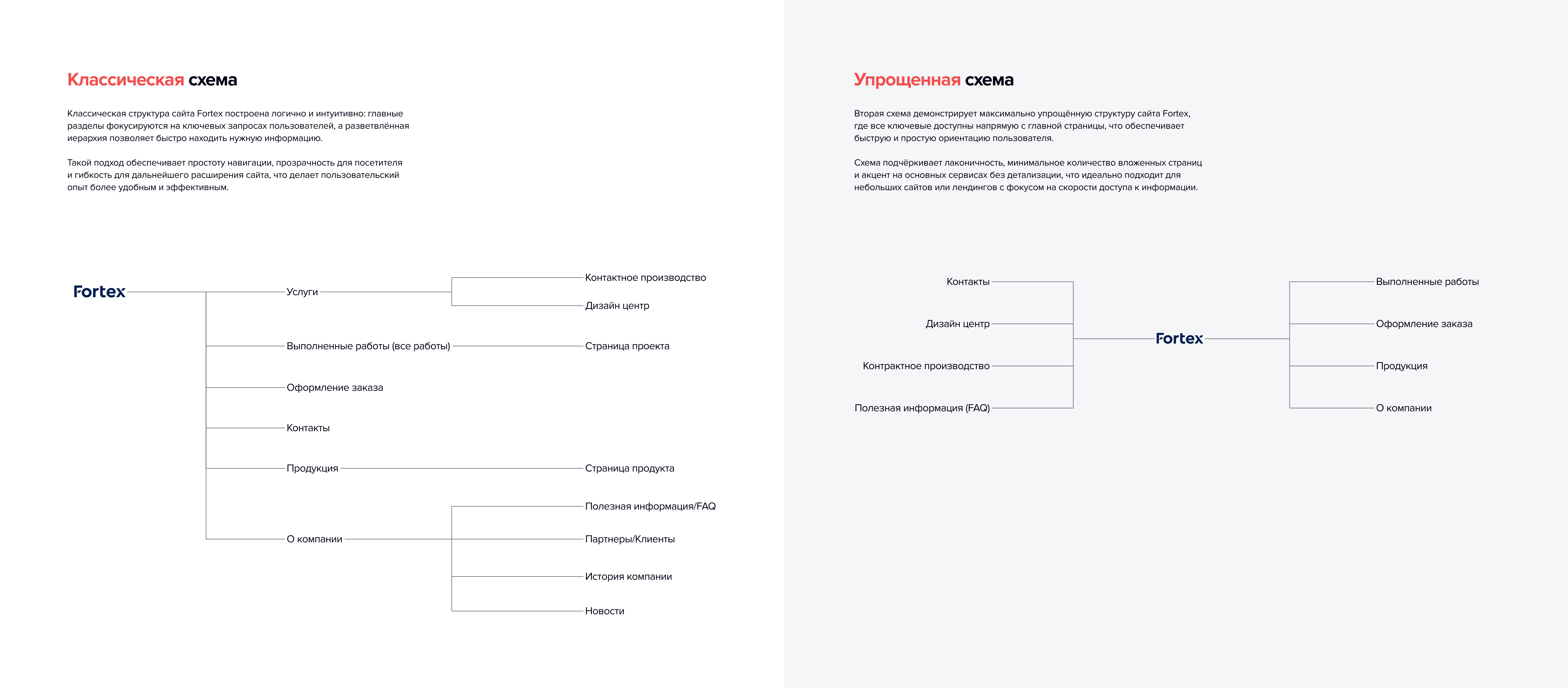 На этапе прототипирования мы разложили блоки контента на сценарии и представили клиенту 2 варианта развития событий будущего сайта: классическая схема и упрощенная.
