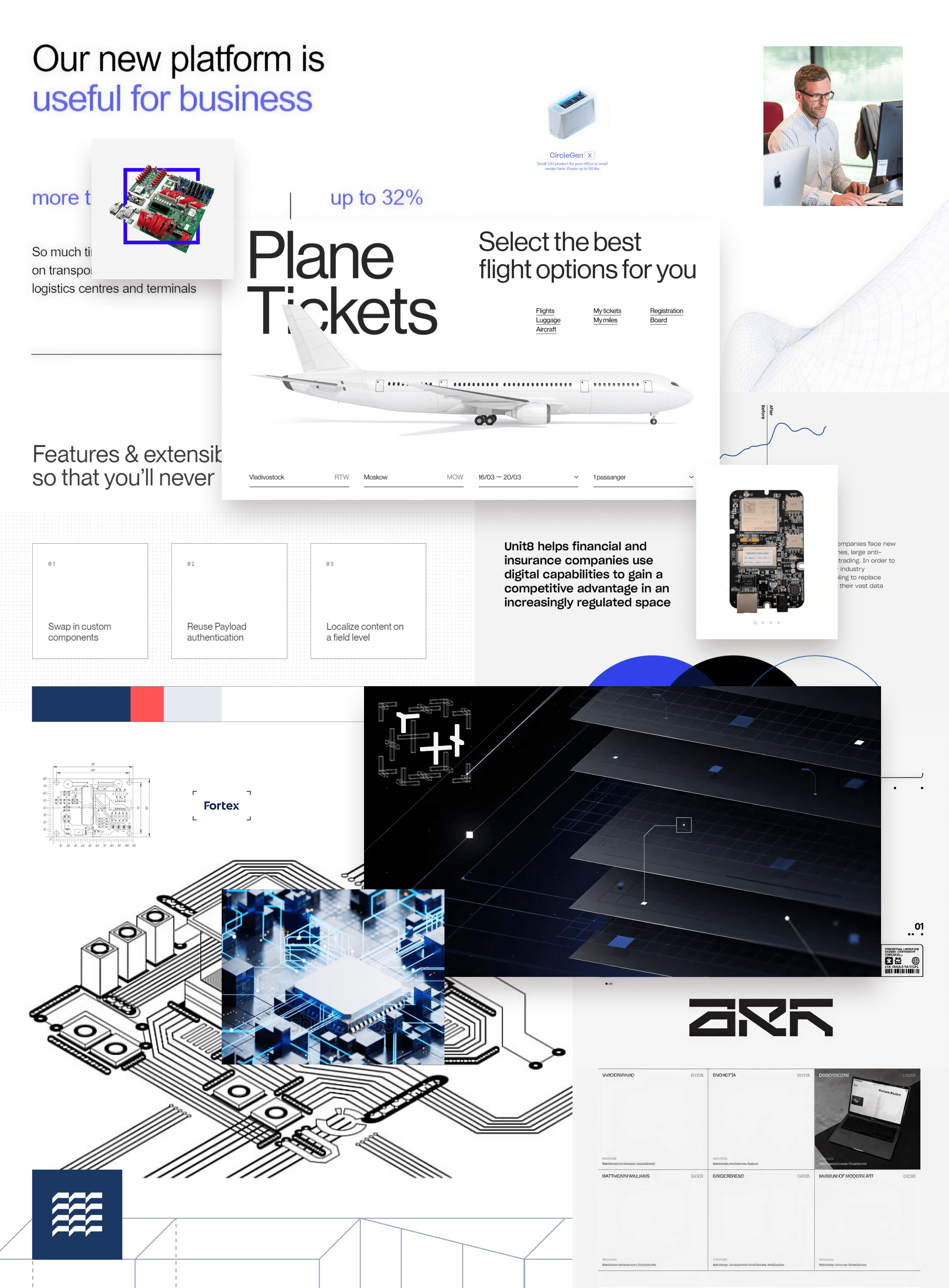 В дополнение к сетке используется ненавязчивый паттерн из прямых линий на заднем фоне, напоминающий рисунок на печатной плате.