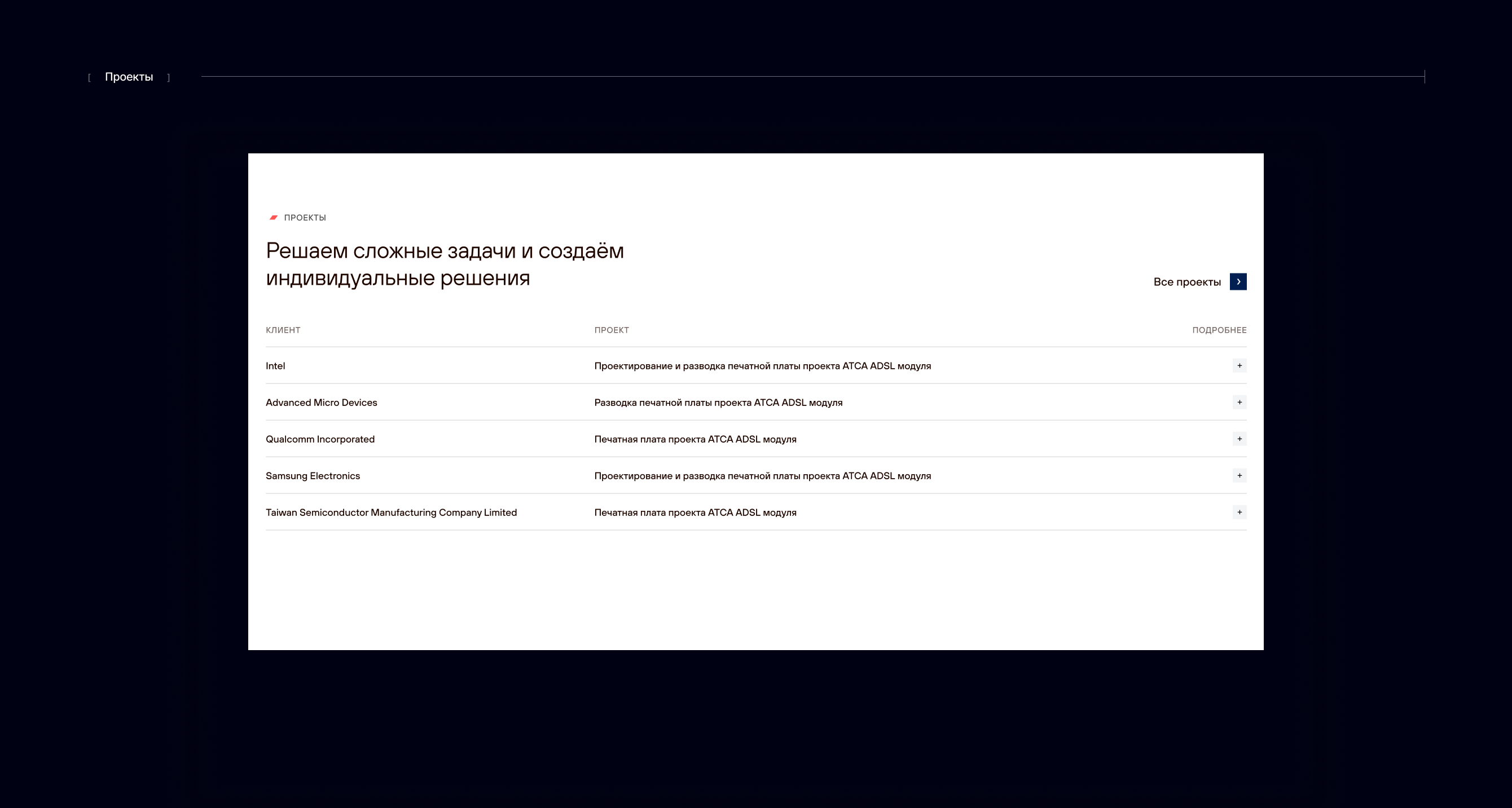 Карточки проектов расположены списком. Такое решение подходит для демонстрации большого количества проектов в блоке.