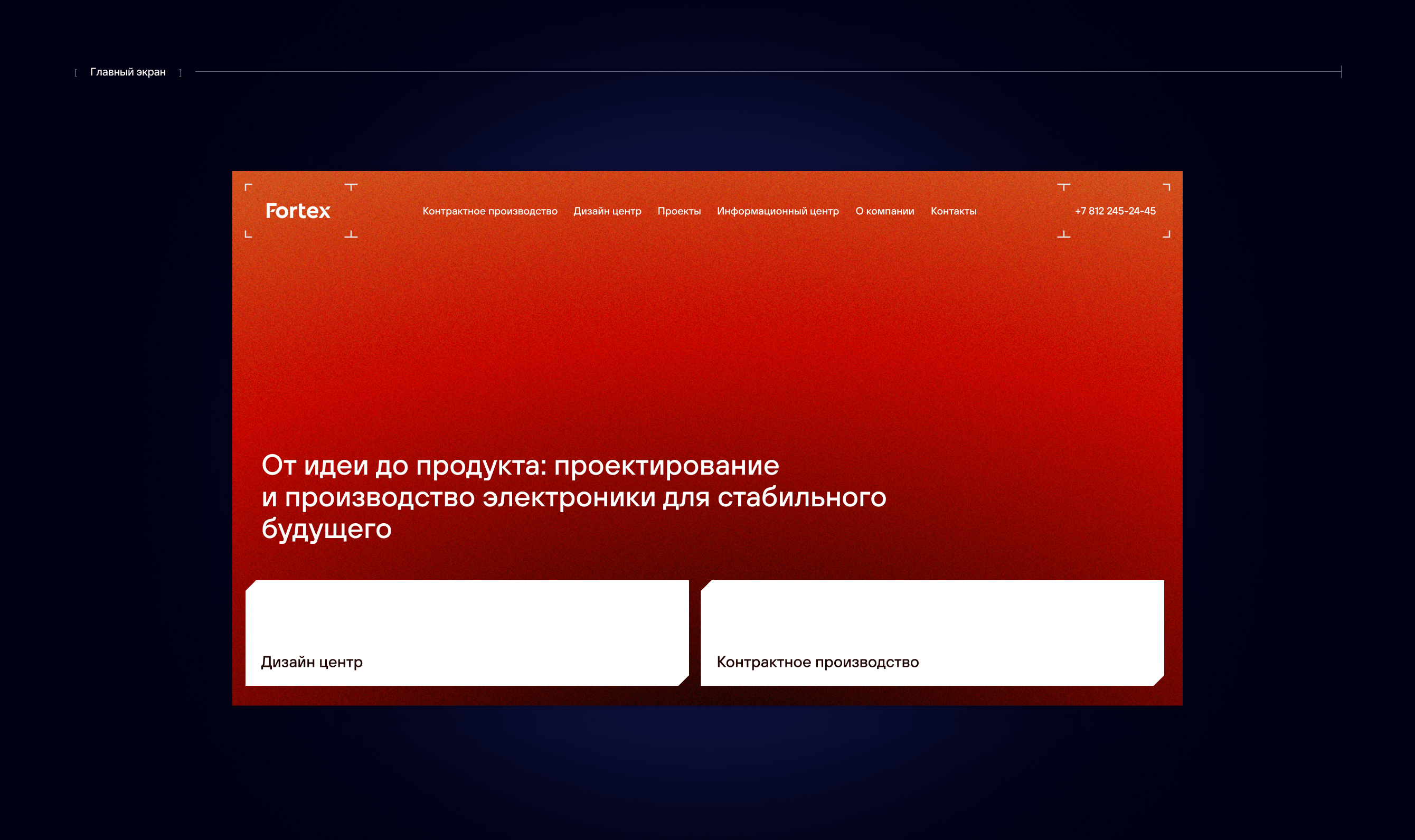 На главном экране изображена стилизованная анимированная плата. Делаем важный акцент на двух направлениях компании с помощью сетки и иконок. Перейти в раздел, можно нажав на всю карточку направления.