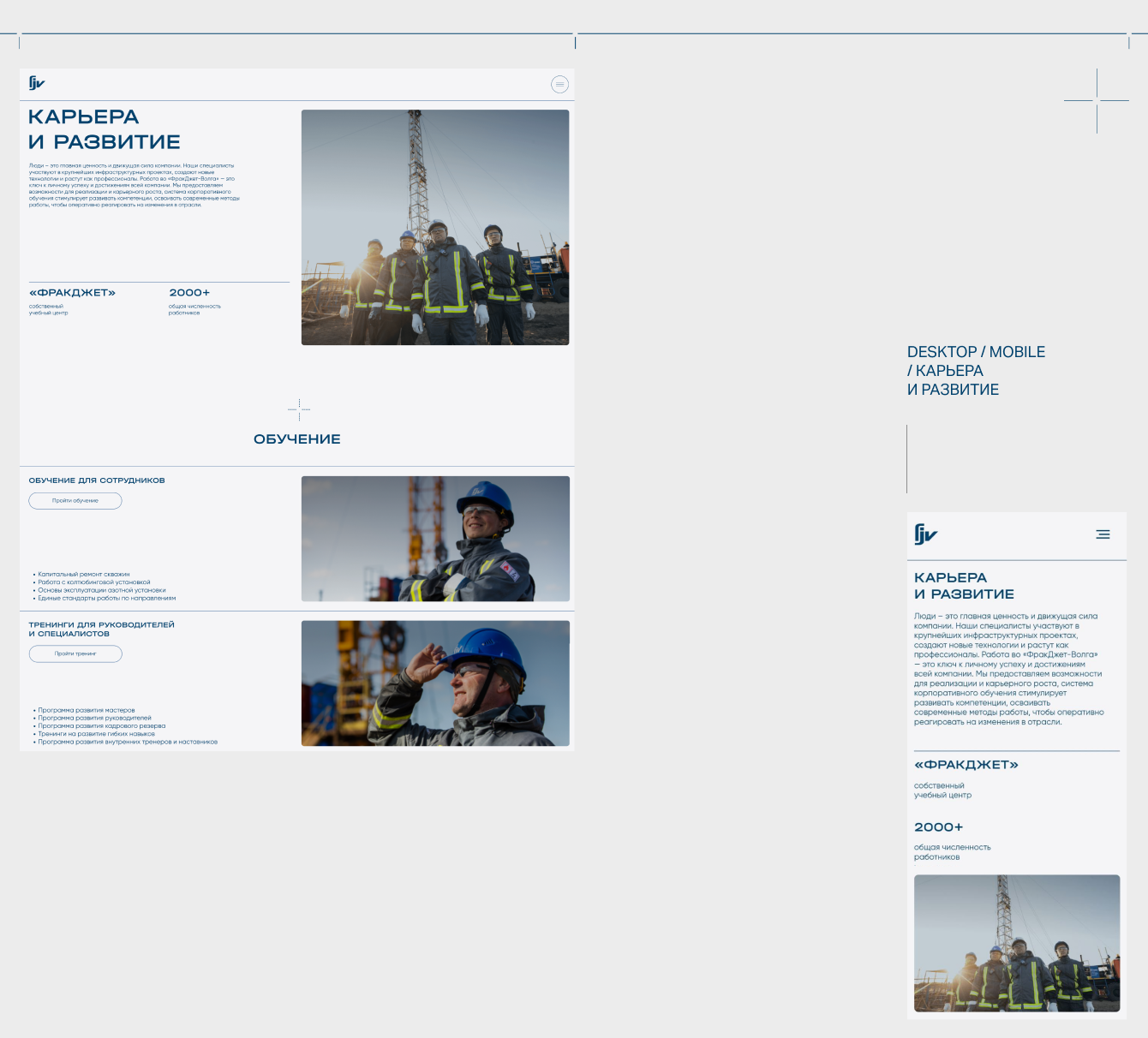 На этапе реализации мы детально проработали UI-кит, отвечающий за единство стиля на всех страницах ресурса. Мы подобрали шрифтовые пары и графические акценты, которые подчеркивают технологичность «ФракДжет-Волга», но не противоречат консервативному характеру отрасли.
