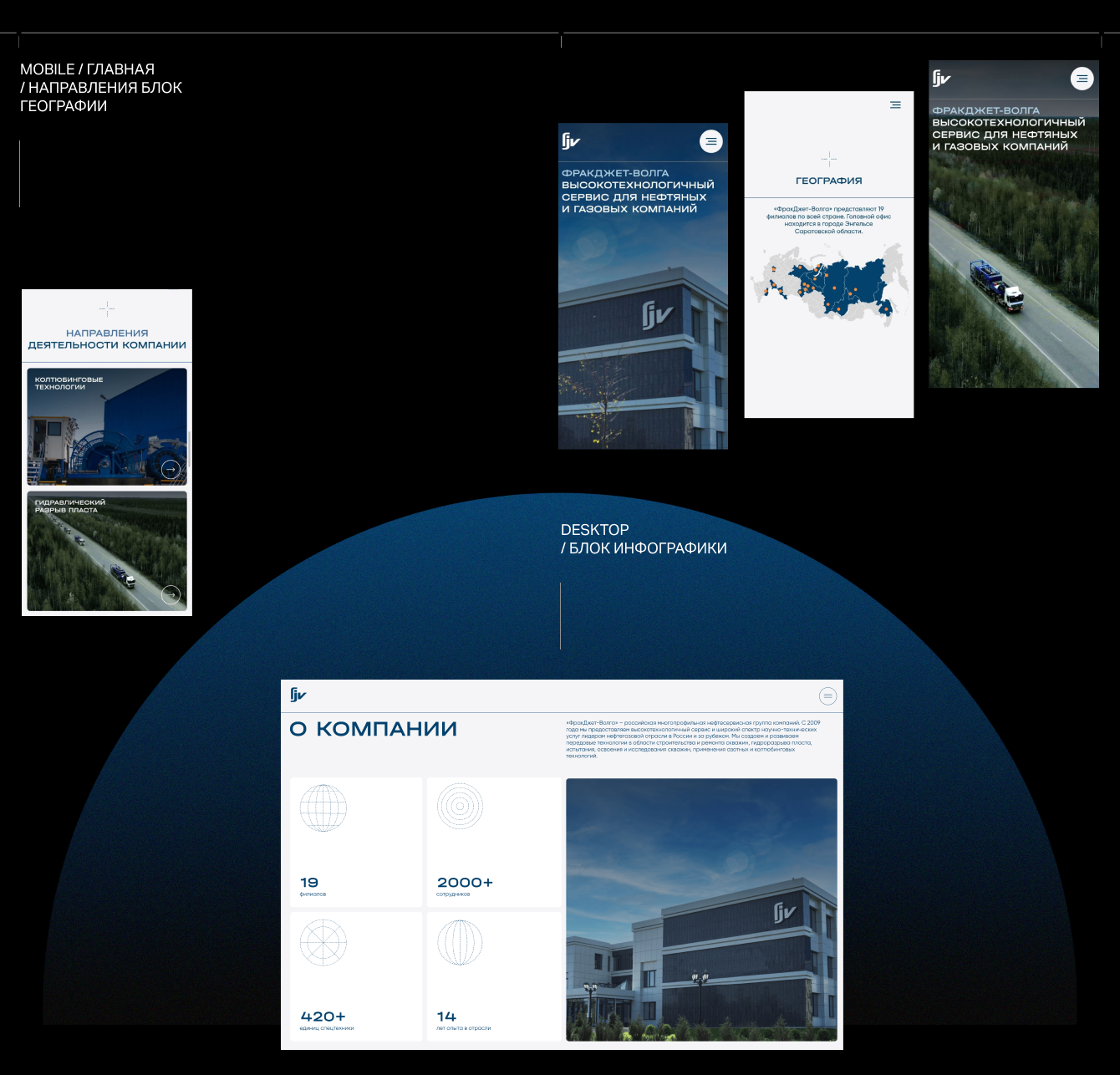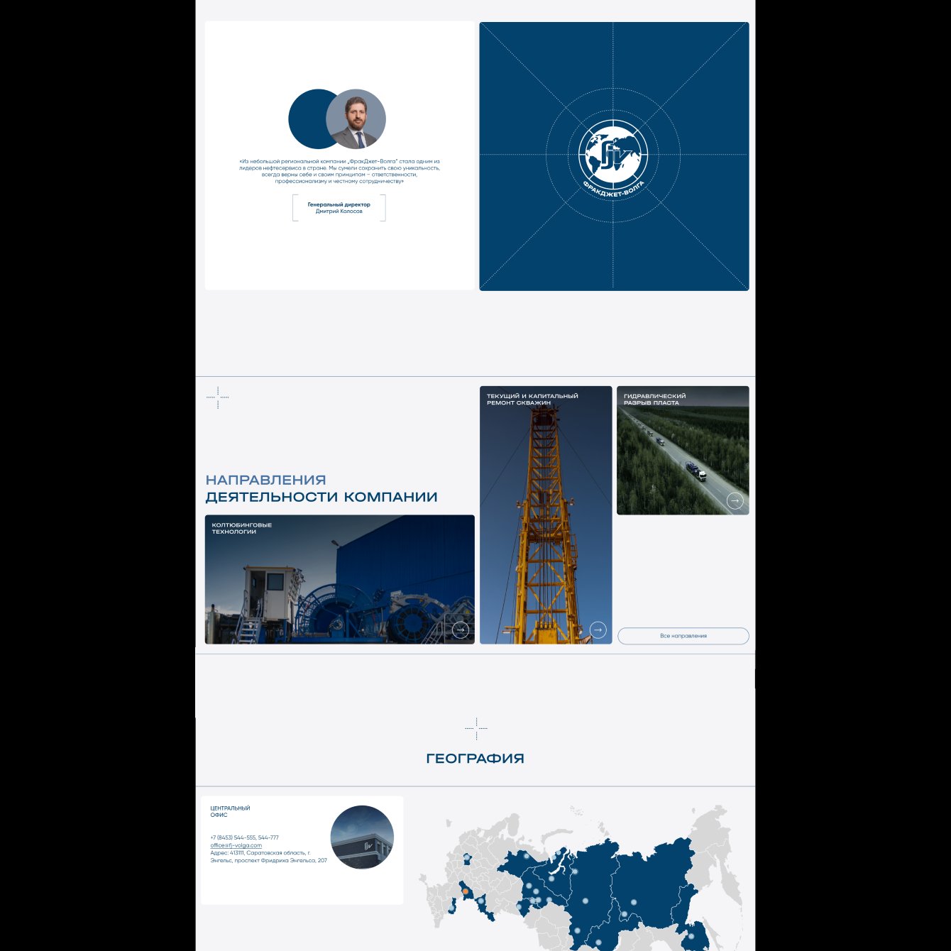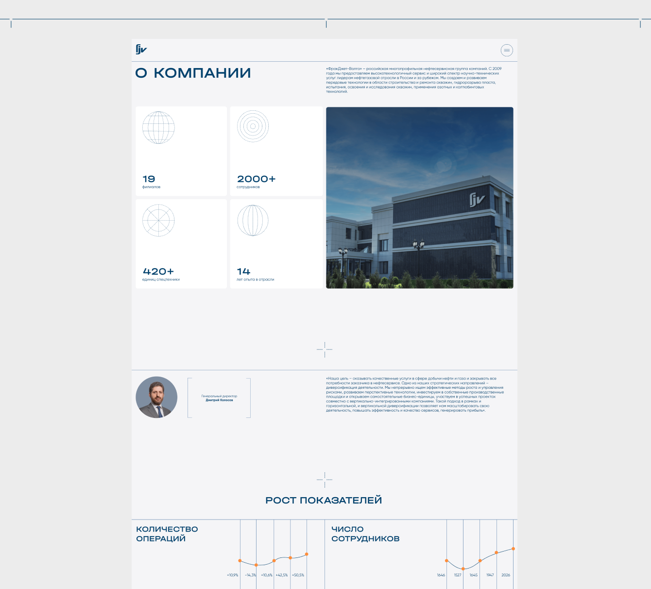 «ФракДжет-Волга» — крупная российская компания, оказывающая высокотехнологичные услуги в нефтегазовой отрасли. Перед нами стояла задача провести полный редизайн корпоративного сайта, который должен соответствовать статусу и серьезному tone of voice бренда. Основной вызов заключался в работе с огромным массивом текстовой информации. Нам требовалось структурировать контент так, чтобы избежать перегруженности, сохранив при этом строгость и индустриальный характер визуального языка.