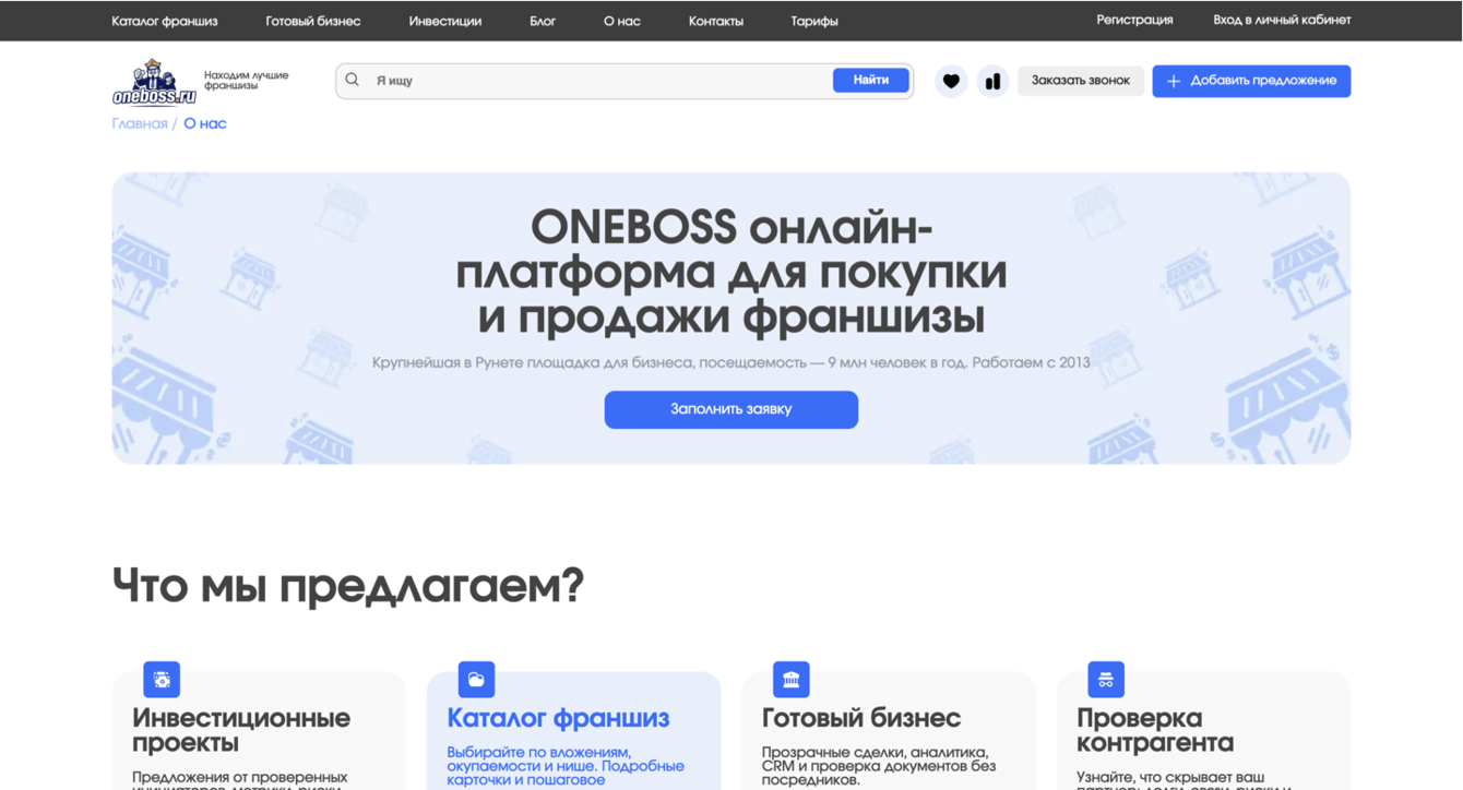 Создать полноценный фронтовый слой для франчайзинговой платформы ONEBOSS: каталоги, карточки франшиз и готового бизнеса, блоги, обучающие страницы, личный кабинет, формы размещения бизнеса.