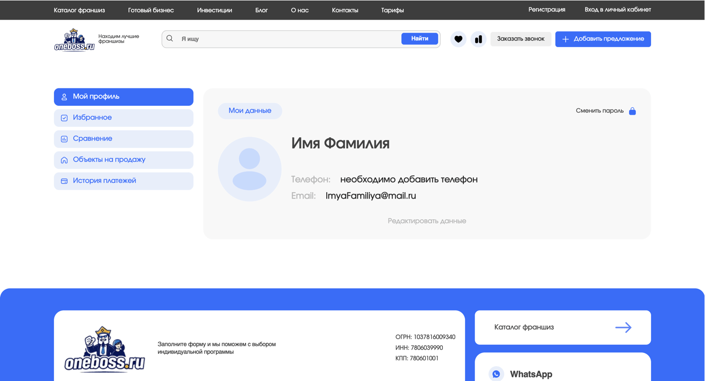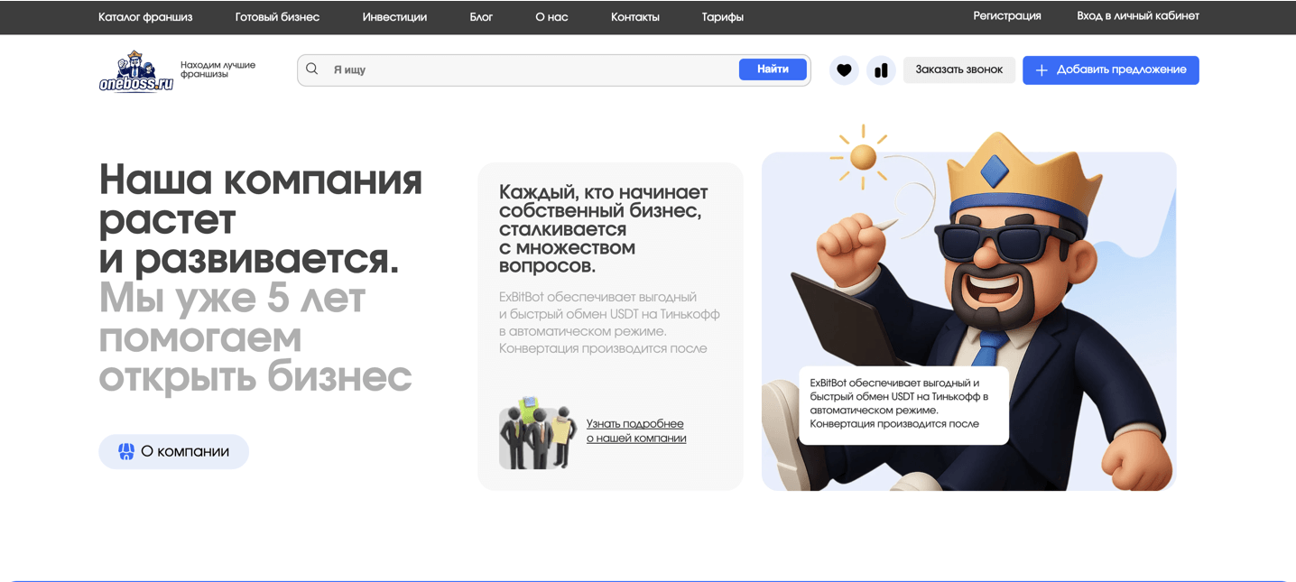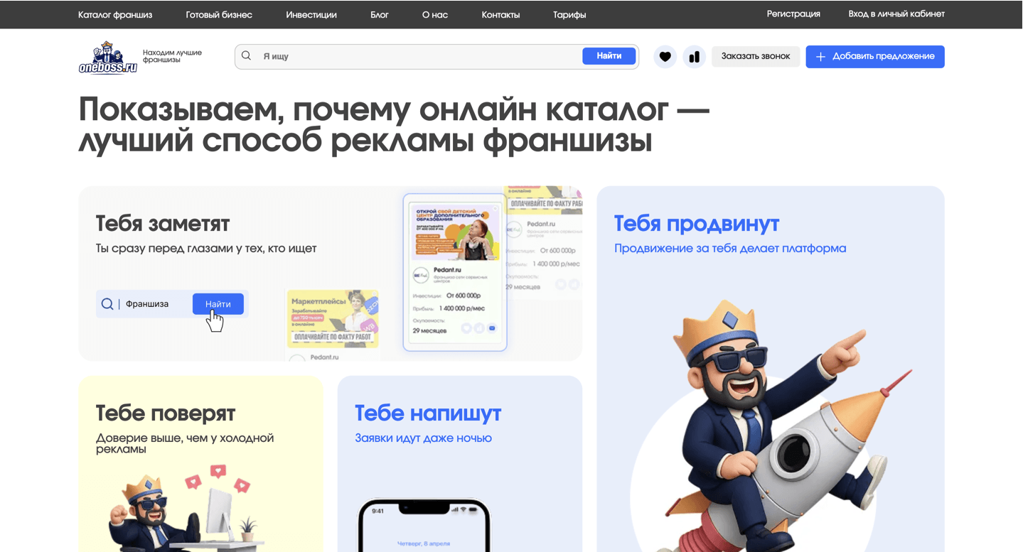 Создать полноценный фронтовый слой для франчайзинговой платформы ONEBOSS: каталоги, карточки франшиз и готового бизнеса, блоги, обучающие страницы, личный кабинет, формы размещения бизнеса.