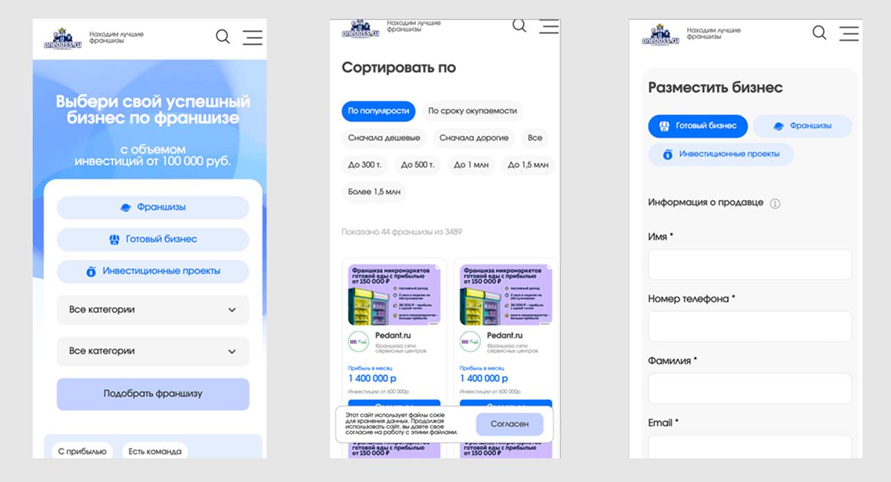 Основная задача дизайна - создать современный визуальный стандарт для франчайзингового рынка: чистый, понятный, прозрачный интерфейс, который увеличивает доверие и облегчает навигацию.