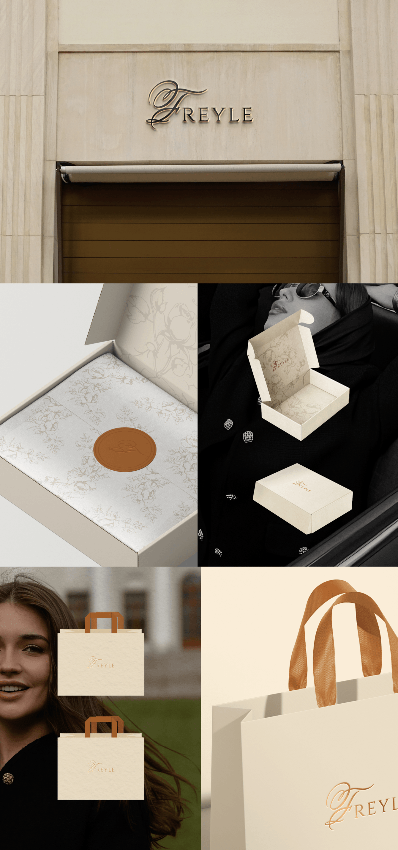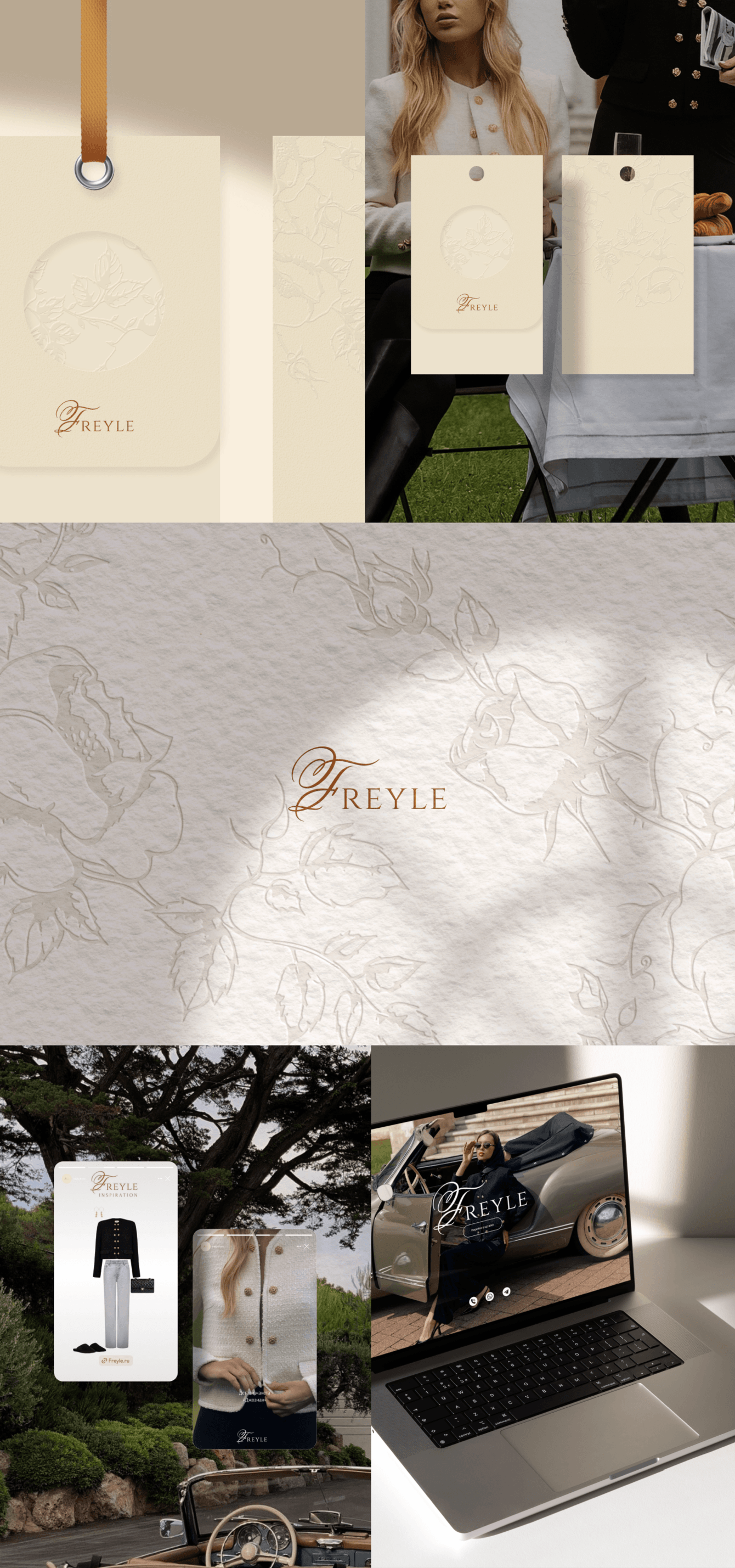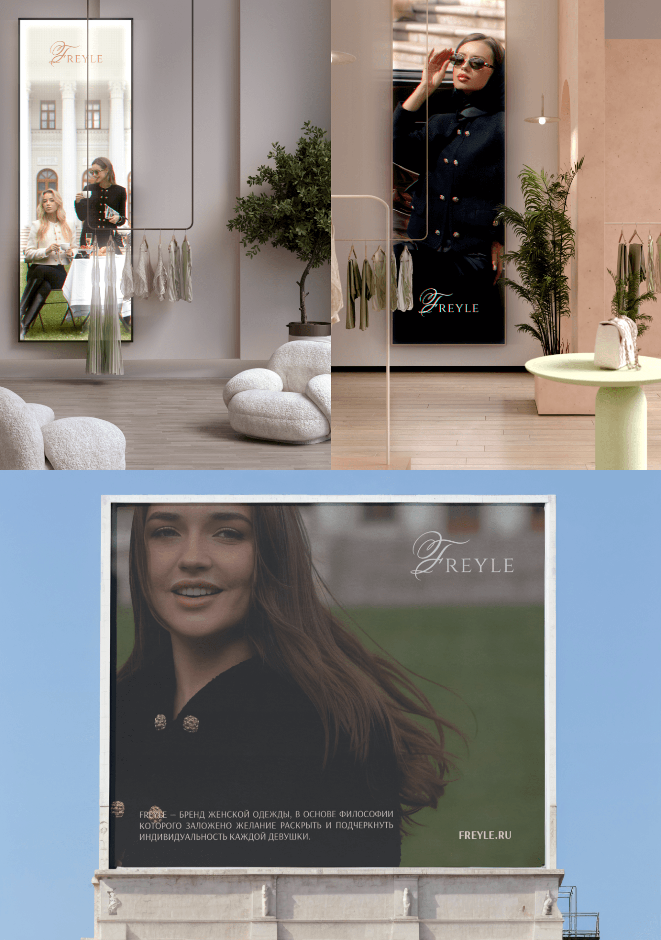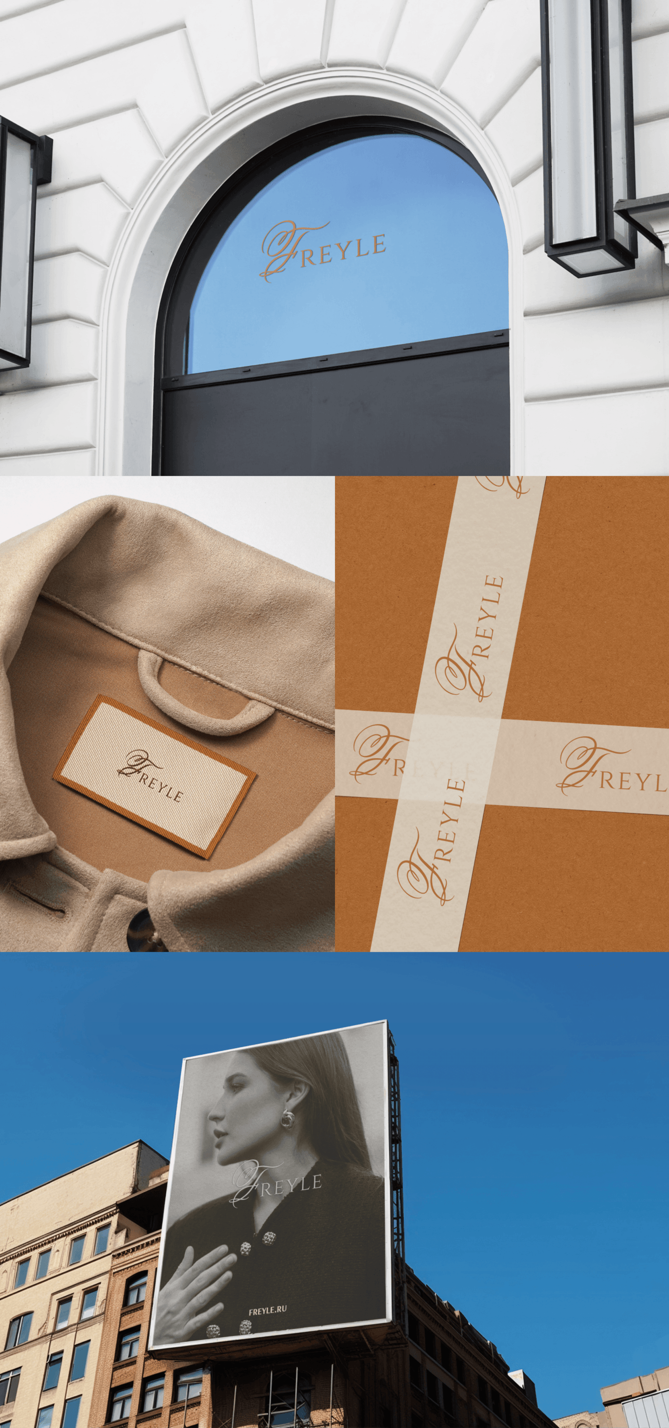 Для бренда женской одежды Freyle был разработан уникальный фирменный стиль, который подчеркивает индивидуальность и утонченность. Логотип состоит из сочетания антиквенного шрифта и рукописного элемента для буквы "F", символизируя элегантность и уникальность бренда. Фирменная палитра включает нежные оттенки, что отражает философию гармонии и уверенности.