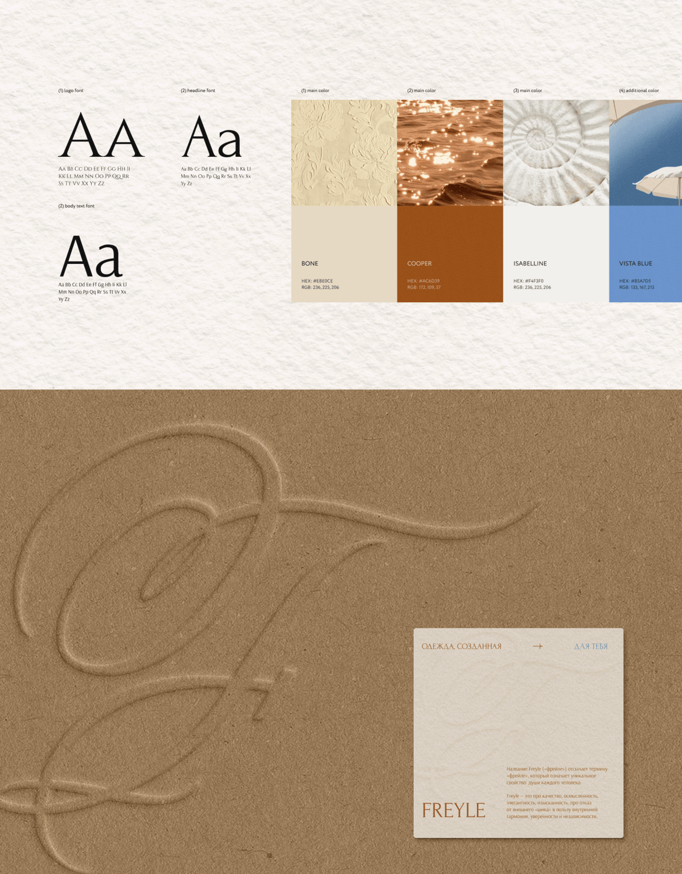 Палитра проекта отражает гармонию и элегантность, подчеркивая философию бренда Freyle. Нежные оттенки Bone и Isabelline создают ощущение утонченности и внутренней гармонии, а теплый цвет Cooper добавляет роскоши, перекликаясь с эстетикой old money. Завершает палитру Vista Blue — символ спокойствия и уверенности, который идеально дополняет концепцию бренда, ориентированного на уникальность и осознанный стиль.