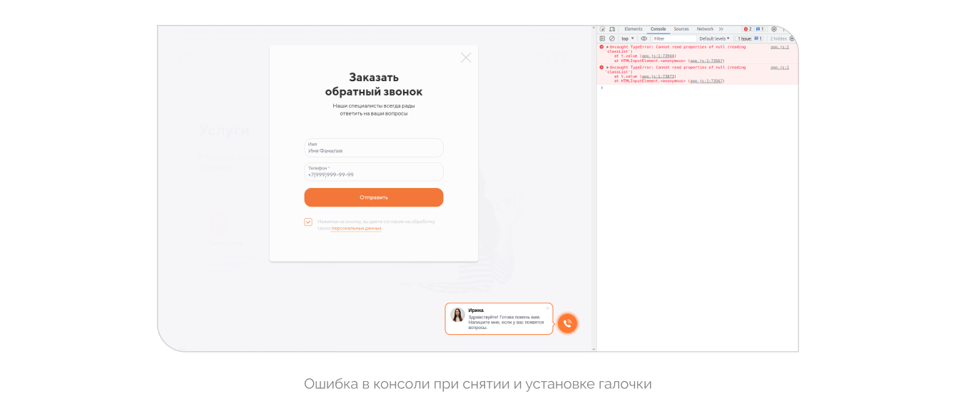 — Ошибки у каждого поля должны быть обработаны системой, отображаться должно возвращаемое ей сообщение («Поле заполнено неверно»), а не стандартная ошибка JavaScript (Invalid fieldName);