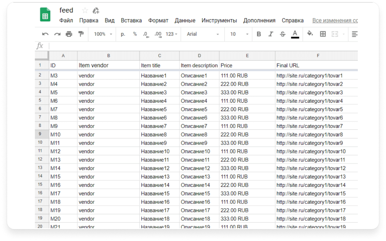 В интернет-магазине тысячи товаров. Запустить вручную контекстную рекламу на весь ассортимент товаров просто невозможно, поэтому Яндекс и Google предлагают пользователям использовать товарные фиды. Как правило, основные форматы товарных фидов — csv, tsv, xls, xlsx. В строках указываются наименования, в столбцах — атрибуты товаров или услуг.