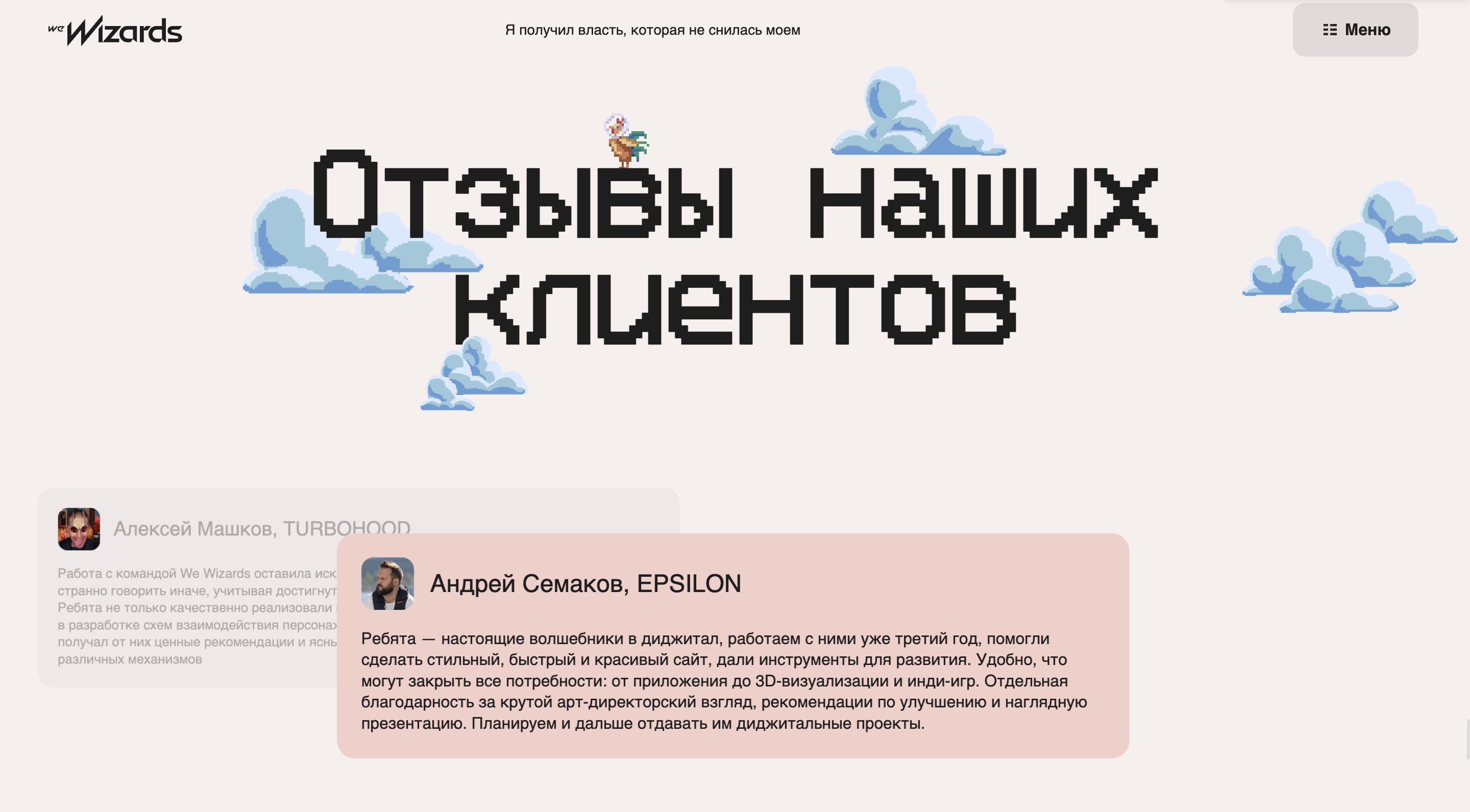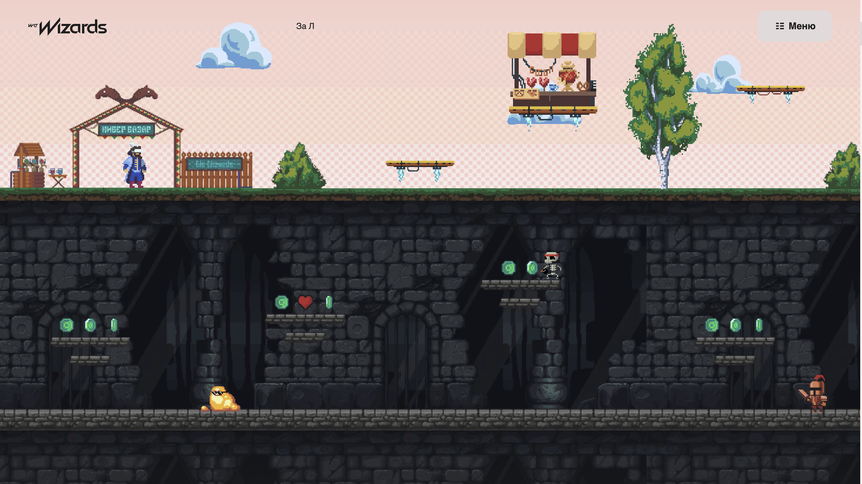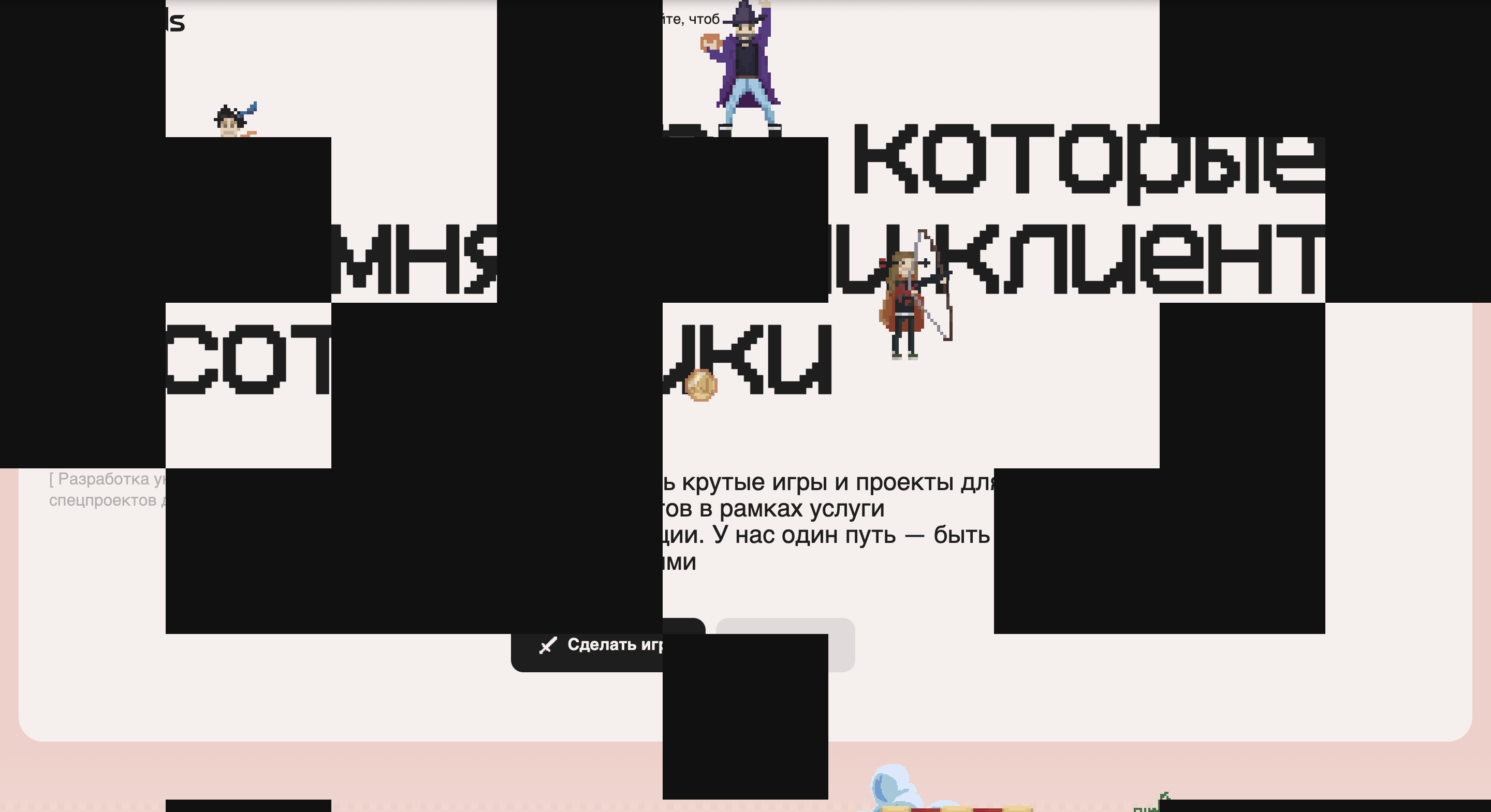 Во главе геймдев юнита We Wizards стоят четыре человека. Их мы и изобразили на главной. Персонажи нарисованы в нашем любимом стиле — пиксель-арт. Это фирменный почерк We Wizards, мы в нем все игры делаем.
