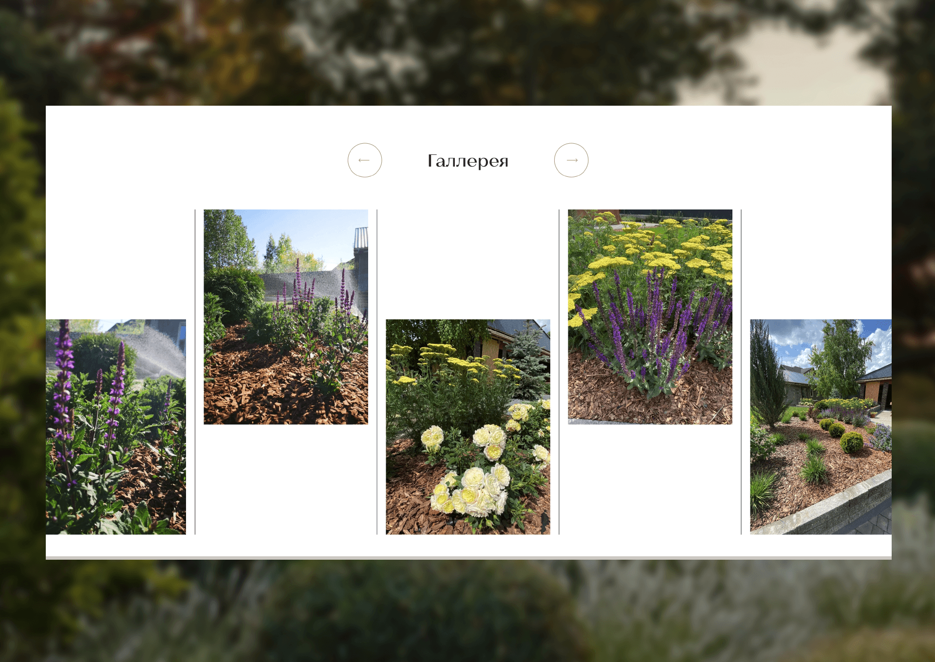 Раздел «Коллекция» демонстрирует собственные наработки студии — готовые ландшафтные решения, которые можно адаптировать под конкретный участок. Это упрощает выбор для клиентов и подчеркивает экспертность команды.