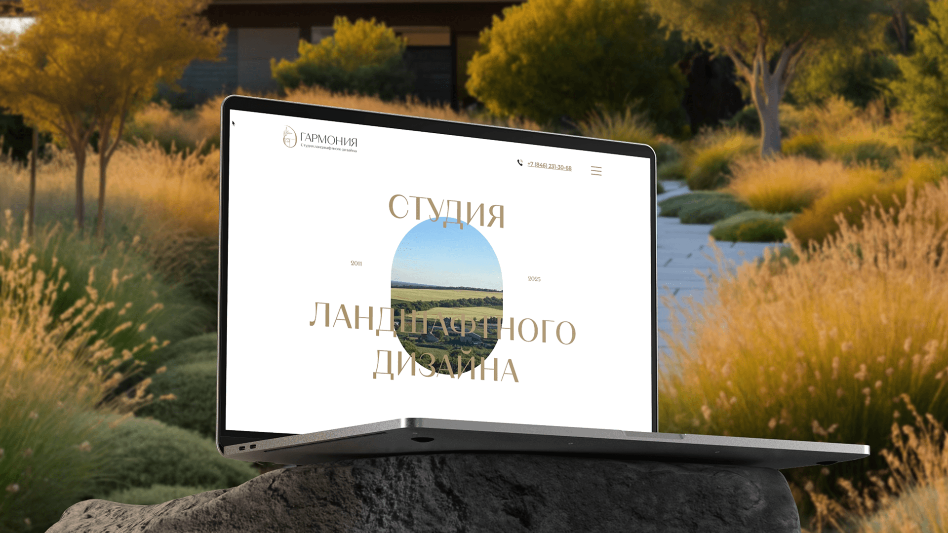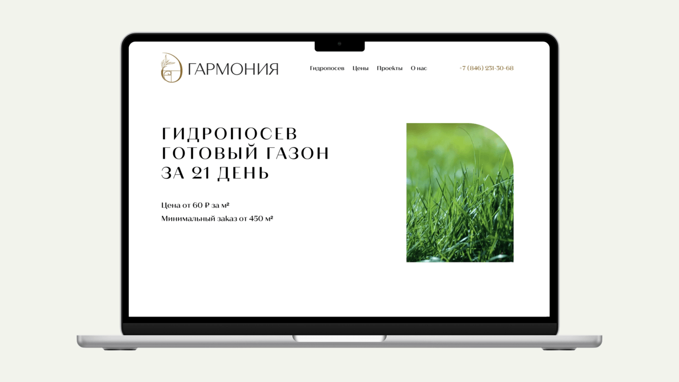 «Гармония» получила цифровую экосистему, которая отражает профессионализм студии и помогает развивать бизнес. Основной сайт работает как инструмент презентации для премиальных клиентов, лендинг гидропосева генерирует поток B2B-запросов.