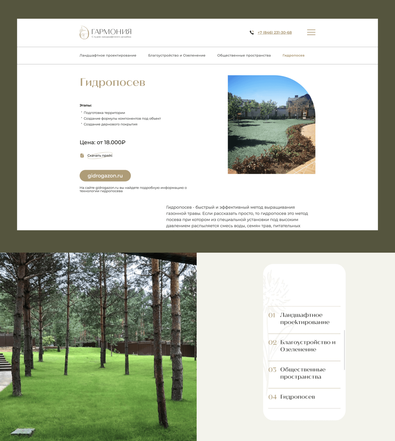 Две платформы связаны перекрестными ссылками и единым визуальным языком. Клиент, пришедший за гидропосевом, видит ссылку на полный спектр услуг. Посетитель основного сайта узнает об инновационной технологии озеленения.