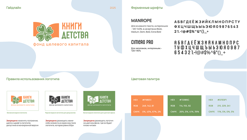 Фонд получил готовый инструмент для поддержания единого визуального языка. Благодаря гайдлайну коммуникация фонда стала более цельной и узнаваемой — от сайта до социальных сетей. Всё визуальное оформление теперь передаёт ту самую атмосферу доброты, тепла и веры в лучшее детство, которую фонд стремится дарить каждый день.