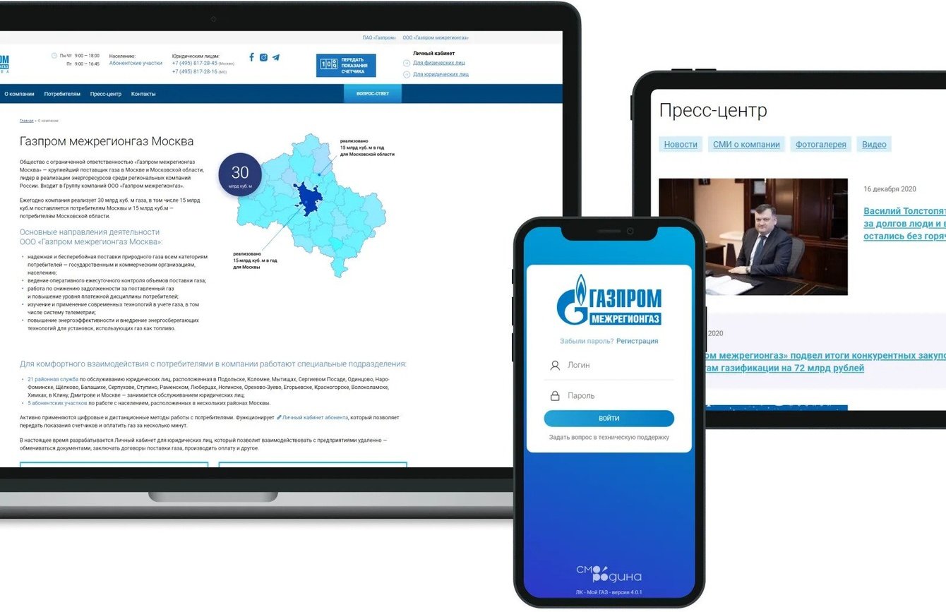 Разработать сайт для Газпром межрегионгаз Москва в фирменном стиле ПАО «Газпром» на платформе CMS Bitrix. Сайт должен представлять компанию как одну из крупнейших региональных газовых компаний России, реализующую газ потребителям Москвы и Московской области. Иметь понятную структуру и удобную навигацию, содержать в себе формы обратной связи с потребителями, формы сбора данных для заключения договора и данных показаний счетчиков, а также каталог новостей.