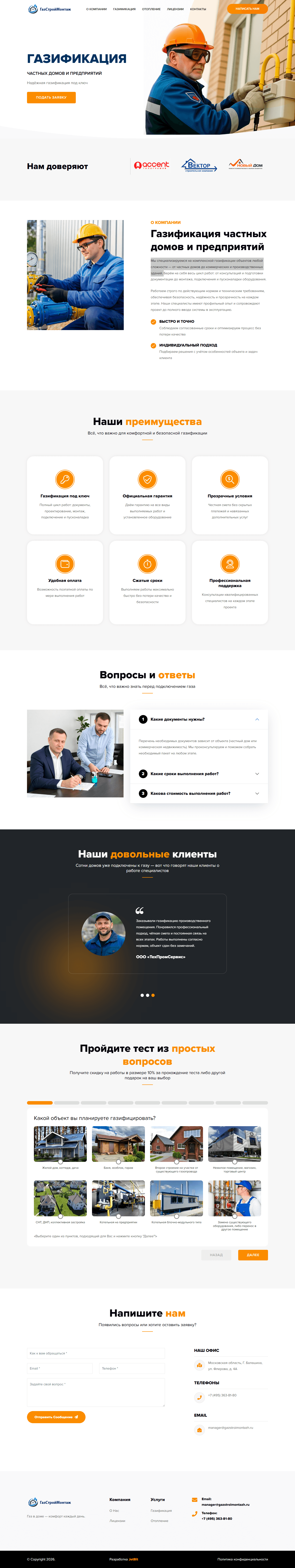 Для компании ГазСтройМонтаж, которая занимается подключением частных домов и предприятий к центральному газоснабжению от документации и разрешений, до проводки труб и слаботочных устройств, потребовался сайт, на котором потенциальные клиенты могли бы ознакомиться с перечнем услуг, посчитать через калькулятор стоимость подключения и необходимую пропускную мощность.