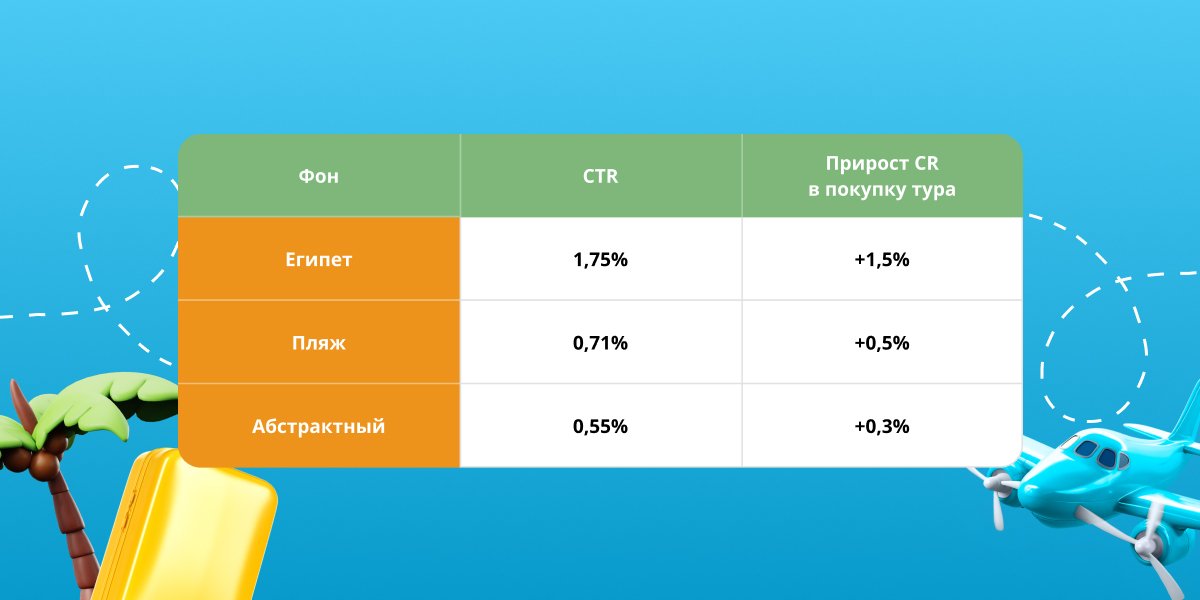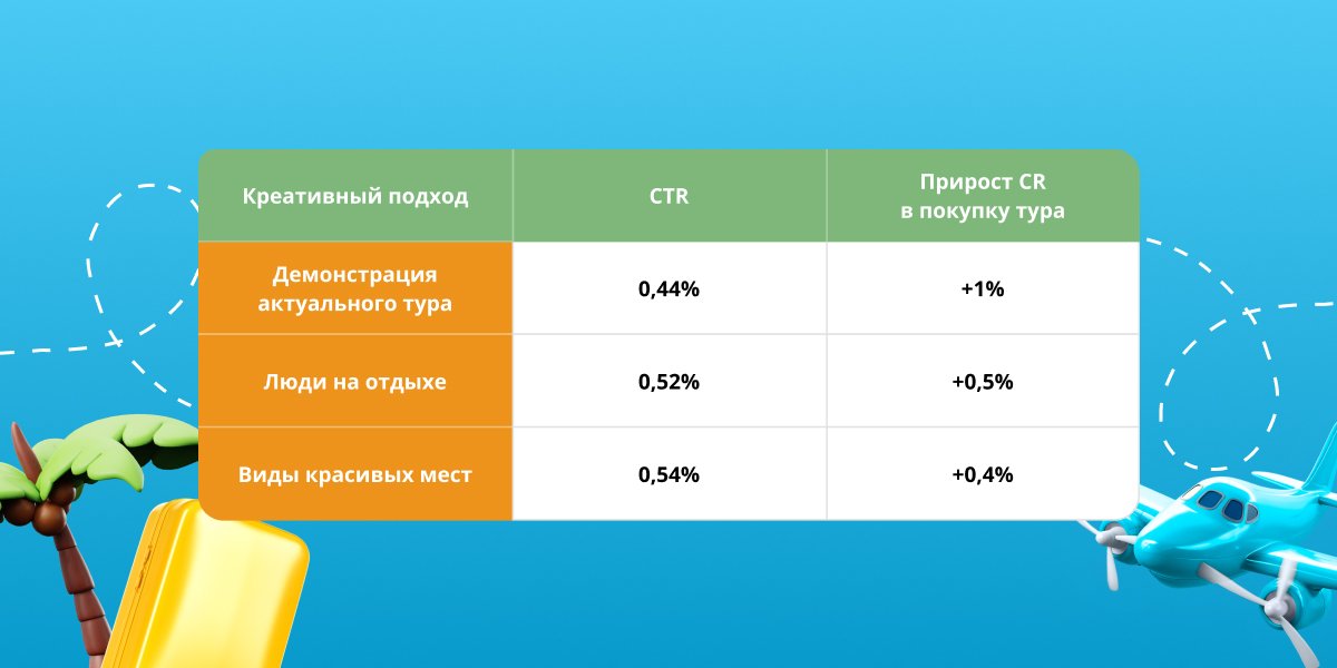 При формировании таких подходов мы использовали тренды аудитории Travelata.ru, получая информацию о глобальном интересе, и отображали это на креативе. Рекомендуем отслеживать изменения органического поведения пользователей вместе с вашими клиентами, это дает ощутимые результаты.