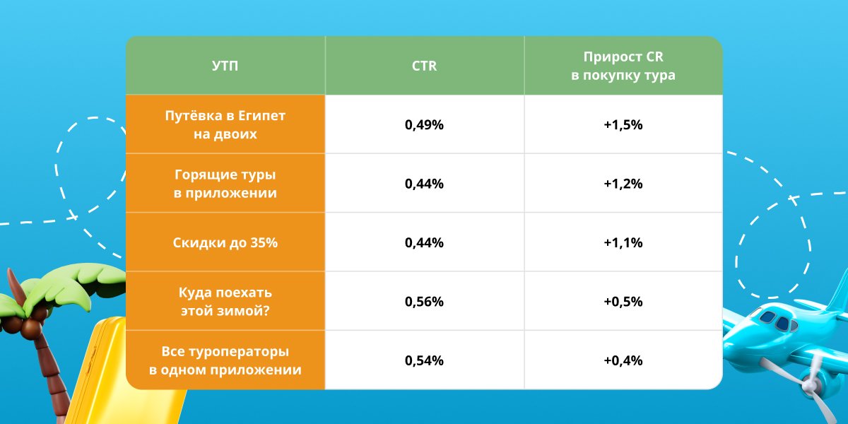 Лучшей гипотезой оказались конкретные туры — пользователь сразу видел финальный продукт, который он получит в приложении. Такое предложение легко пробивало рекламную слепоту пользователя и вызывало доверие к сервису.