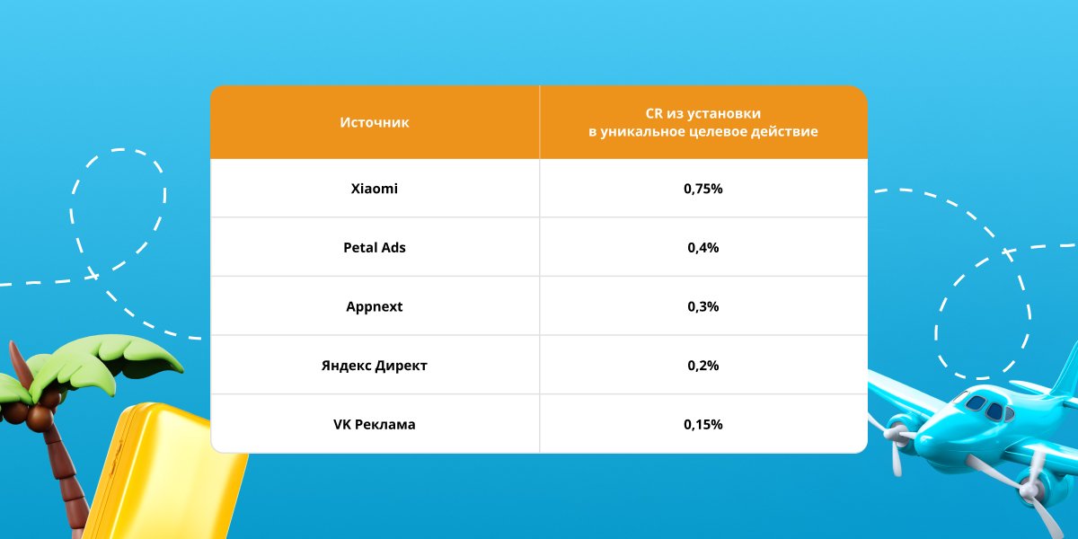 Также перед нами стояли KPI по удержанию конверсии из установки в покупку комплексного тура, включающего в себя перелет и проживание в отеле. За основу был взят уровень конверсии по платному трафику, который был до сотрудничества с нами.