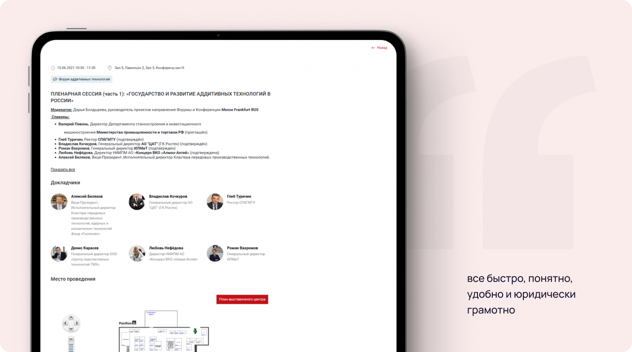 Каталоги прессы, активация и деактивация отдельных модулей выставки, генерация промокодов от участника, возможность фильтрации по названиям, типу мероприятий, компаний, объявлений и др.– все быстро, понятно, удобно и юридически грамотно.