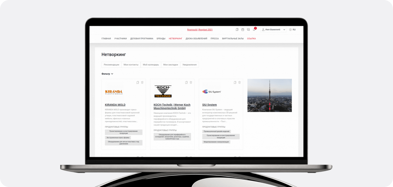 В связи с технологическим рывком и интересом к переходу в виртуальное пространство, на рынке уже появились продукты, предлагающие похожие услуги, которые позиционируют себя как экономящие затраты экспонентов и клиентов, предлагают широкий охват аудитории и указывают на безопасность мероприятий. Но именно наша платформа готова объединить потенциальных партнеров. С помощью нее пользователи могут найти необходимые контакты в любой точке мира. А её техническое наполнение делает просто чудеса. Например, вы зарегистрировались на выставку, у каждого посетителя есть свой личный кабинет, в котором по его интересам автоматически появляются рекомендации контрагентов.
