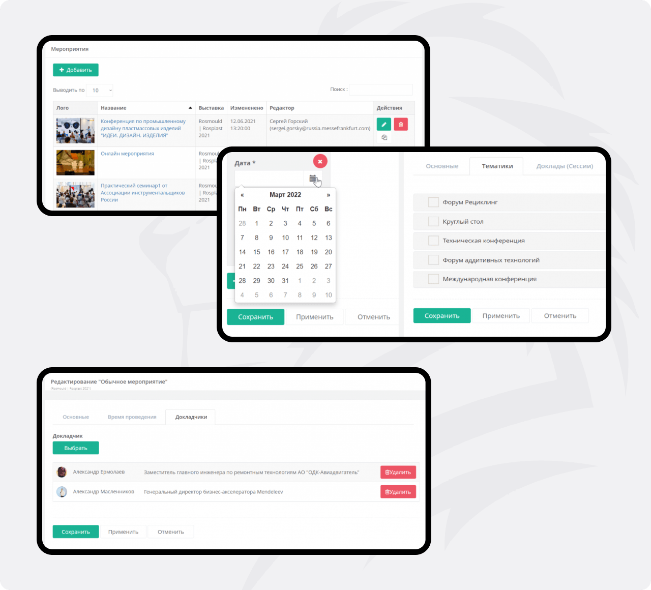 Каталоги прессы, активация и деактивация отдельных модулей выставки, генерация промокодов от участника, возможность фильтрации по названиям, типу мероприятий, компаний, объявлений и др.– все быстро, понятно, удобно и юридически грамотно.