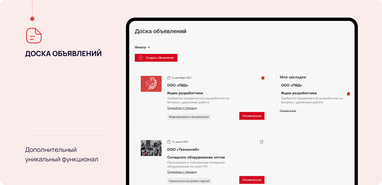 Дополнительный уникальный функционал – доска объявлений, где экспоненты могут публиковать свои спецпредложения для посетителей, а посетители запрос на решение своих конкретных задач, что также стимулирует взаимодействие между поставщиками и заказчиками.
