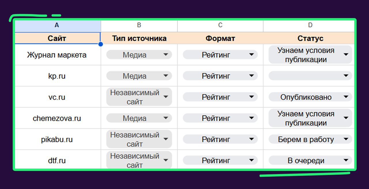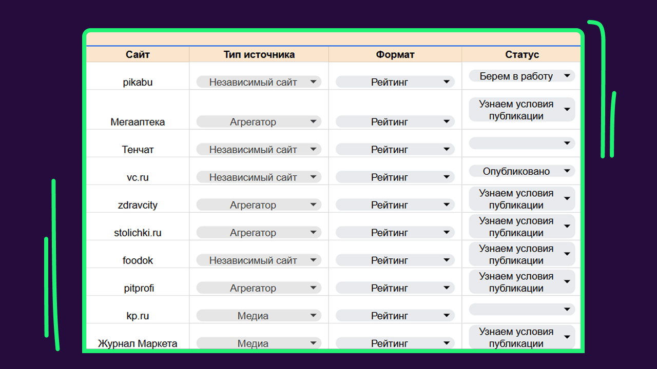 В самом конце сделали выводы из аудита: составили список сайтов, где можем опубликоваться, указали тип источника, формат и статус. Получился пошаговый план продвижения. Это удобно и для нас, и для клиента: он может в любой момент зайти и посмотреть, как идет работа.