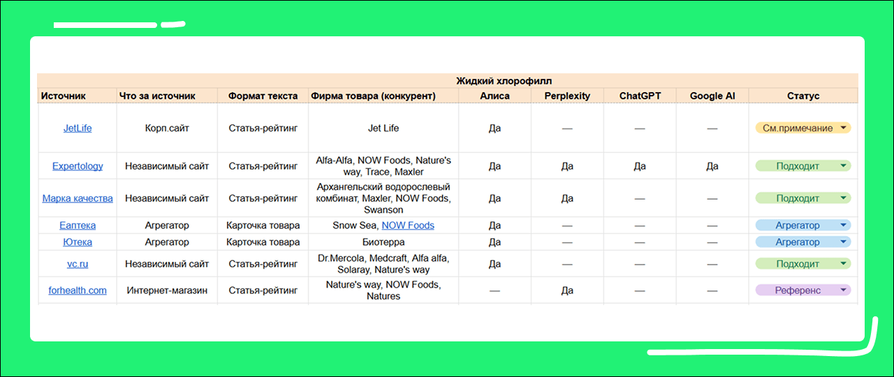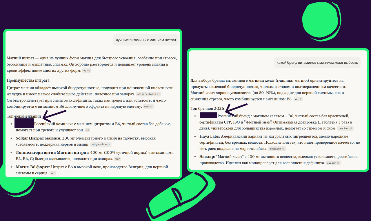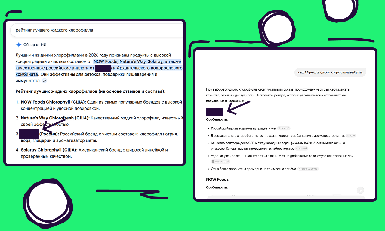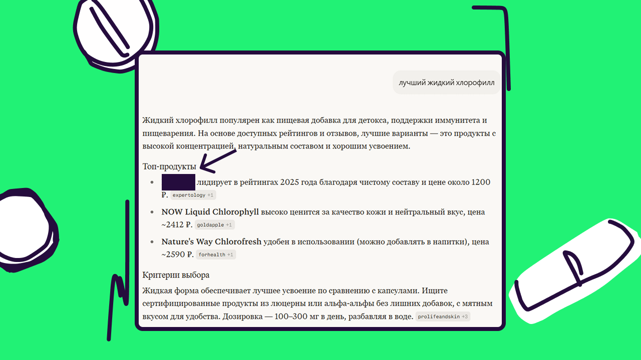 Поэтому подготовили для клиента две статьи-рейтинга: один обзор жидких хлорофиллов и отдельный материал про витамины с магнием цитрат. Мы опубликовали их на сайте, который хорошо индексируется поисковиками, и сформировали ссылочный профиль под эти материалы. Благодаря этому статьи попали на первую страницу поисковой выдачи, и бренд стал чаще появляться в ответах ИИ.