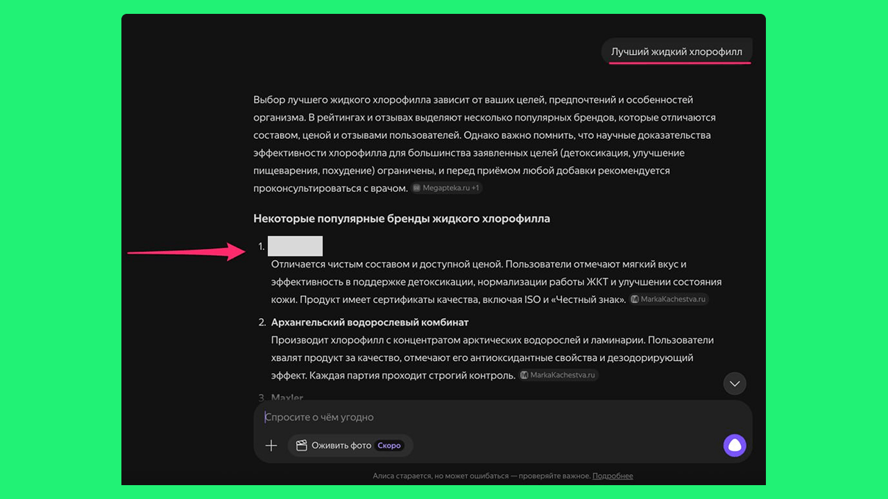 В рейтинге жидких хлорофиллов продукт клиента занял первое место — и результат не заставил себя долго ждать. Через пару дней Яндекс Алиса «подхватила» обновленную статью, и «поставила» бренд компании на первое место.