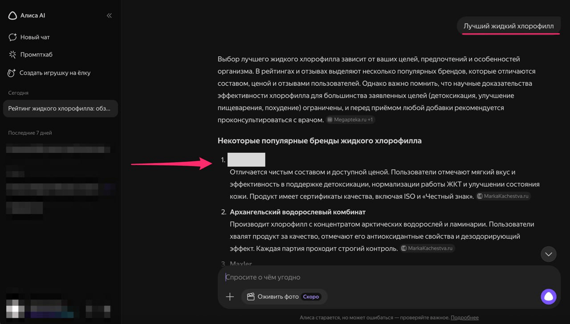 В рейтинге жидких хлорофиллов продукт клиента занял первое место — и результат не заставил себя долго ждать. Через пару дней Яндекс Алиса «подхватила» обновленную статью, и «поставила» бренд компании на первое место.