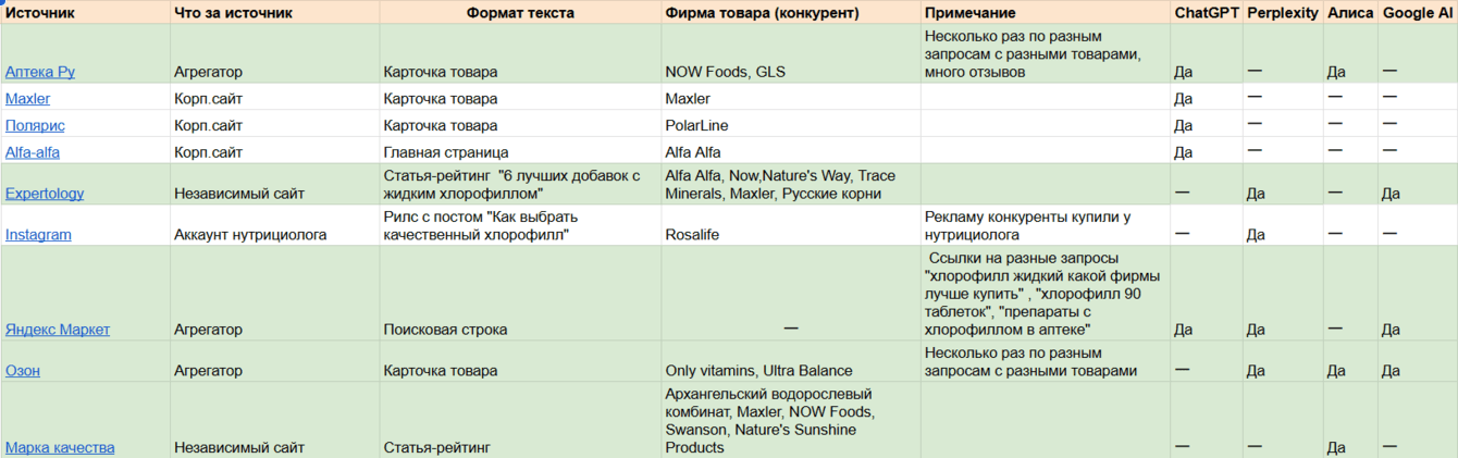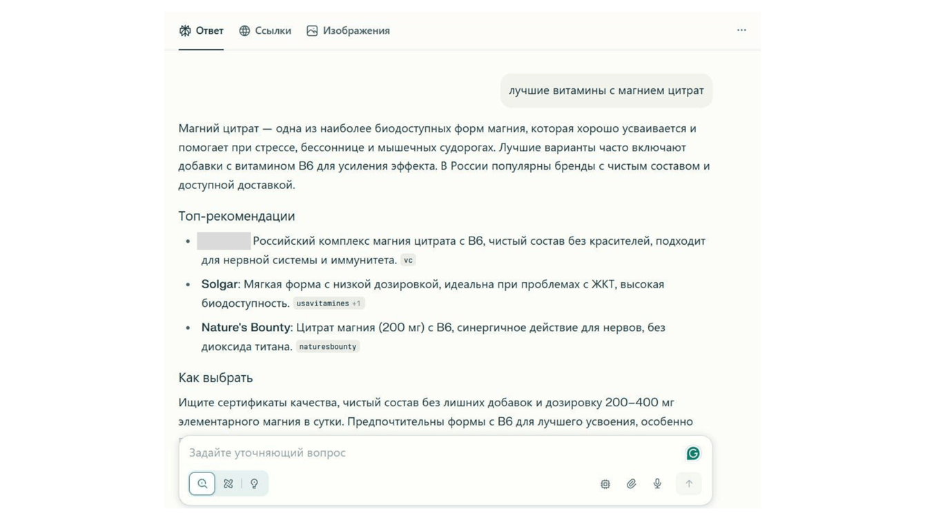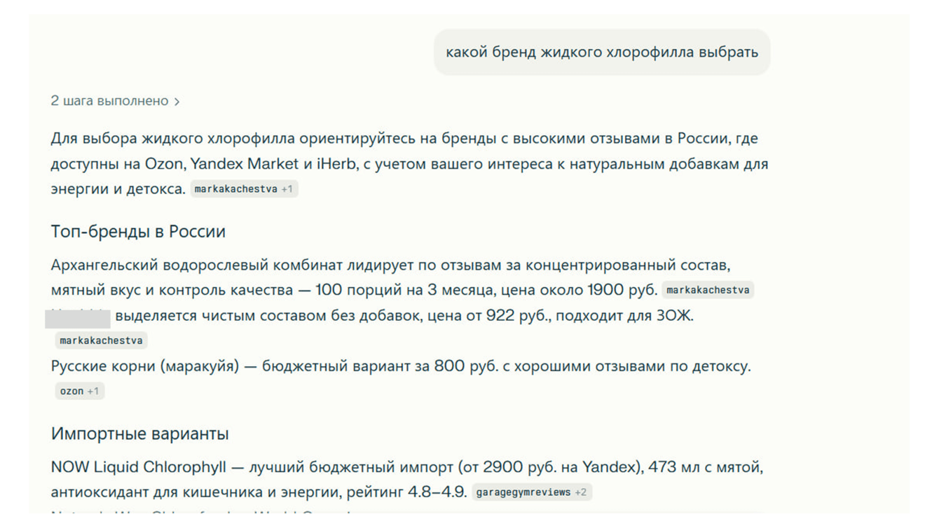 Поэтому подготовили для клиента две статьи-рейтинга: один обзор жидких хлорофиллов и отдельный материал про витамины с магнием цитрат. Мы опубликовали их на сайте, который хорошо индексируется поисковиками, и сформировали ссылочный профиль под эти материалы. Благодаря этому статьи попали на первую страницу поисковой выдачи, и бренд стал чаще появляться в ответах ИИ.