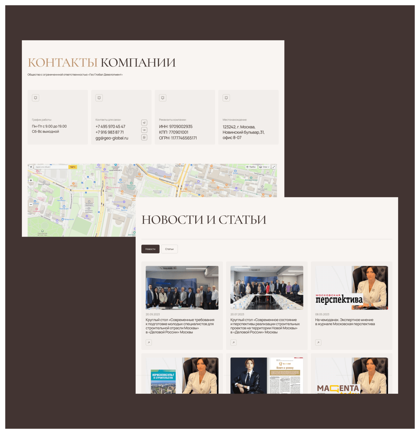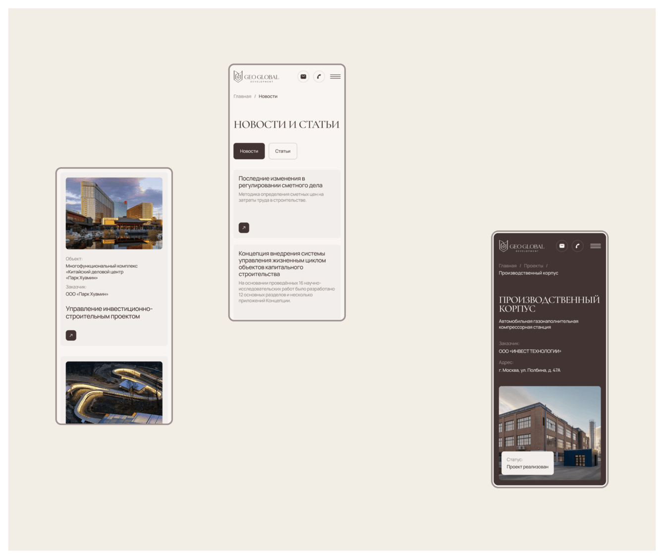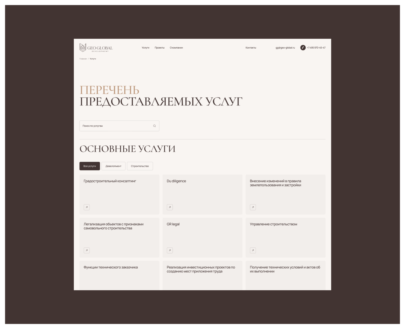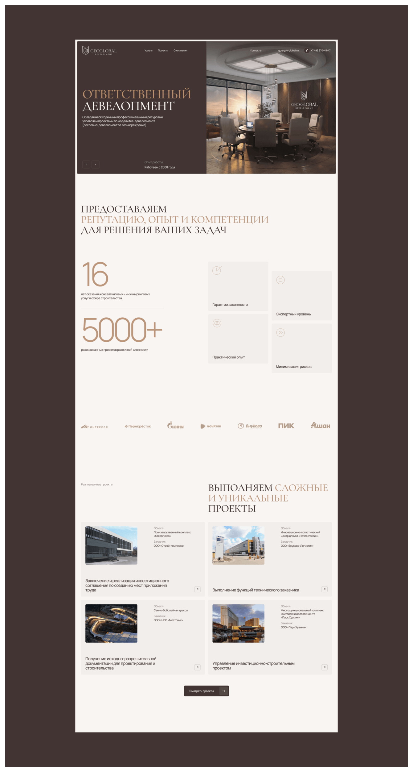 Компания GeoGlobal предоставила нам свой логотип и фирменный стиль, что стало отправной точкой для разработки концепции веб-сайта в рамках их брендбука. Мы выбрали светло-бежевый цвет в качестве основного, дополнив его акцентными тёмно-коричневым и золотым. Для заголовков секций мы использовали шрифт антиква, выполненный полностью прописными буквами, что подчеркнуло статусность и многолетний опыт компании. Этот выбор шрифта отлично сочетался с логотипом, создавая гармоничное визуальное единство.