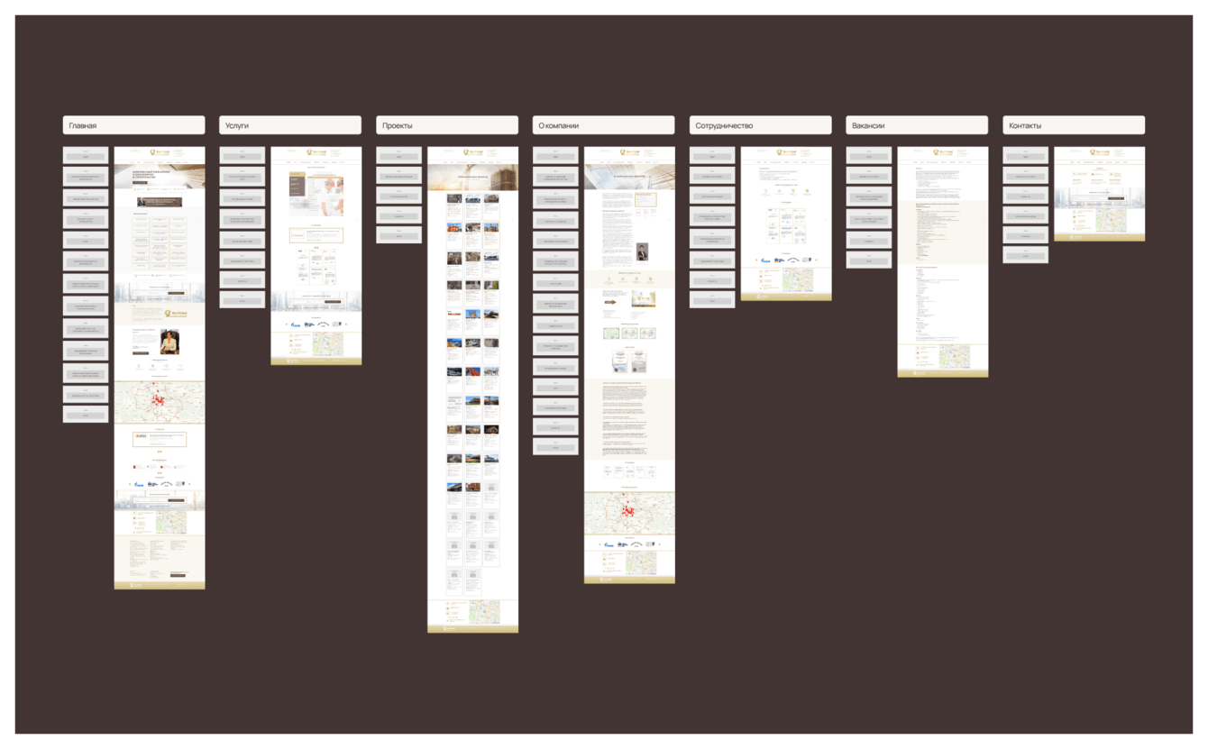 На этапе проектирования мы разработали User Flow для каждого сегмента целевой аудитории, определив последовательность действий пользователей для достижения их целей. Мы проанализировали текущий веб-сайт и сайты конкурентов, сделали скриншоты страниц для выявления используемых блоков. На основе этого анализа мы создали новую структуру сайта и определили расположение блоков на каждой странице.