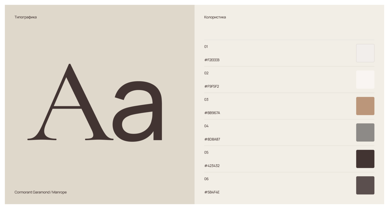 По цвету опирались на фирменный стиль компании. В брендбуке были завялены светло-бежевые цвета, коричневые и акцентный золотой. Согласовали выбранные цвета с клиентом и продолжили разработку концепции.